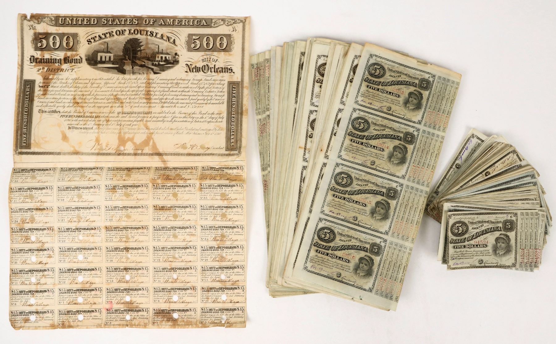 About 450 State of Louisiana $5 Bonds. Small format about 3x5 inches. All the same, some coupons attached. Half of them are in sheets of 4. Also included is larger New Orleans Draining Bond with coupons attached. See photo.