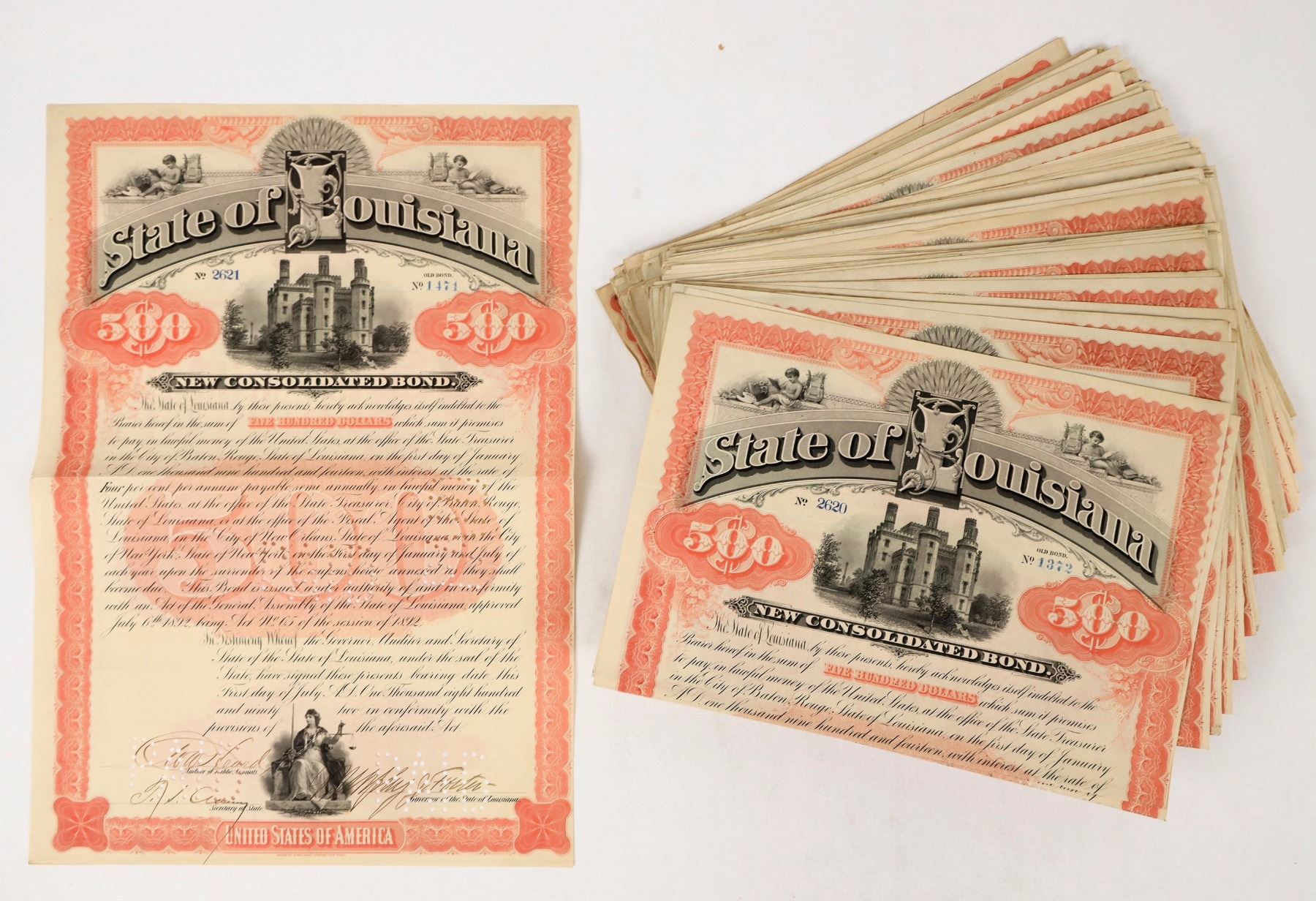 95 State of Louisiana New Consolidated $500 Bonds. All the same, some coupons attached. See photo.