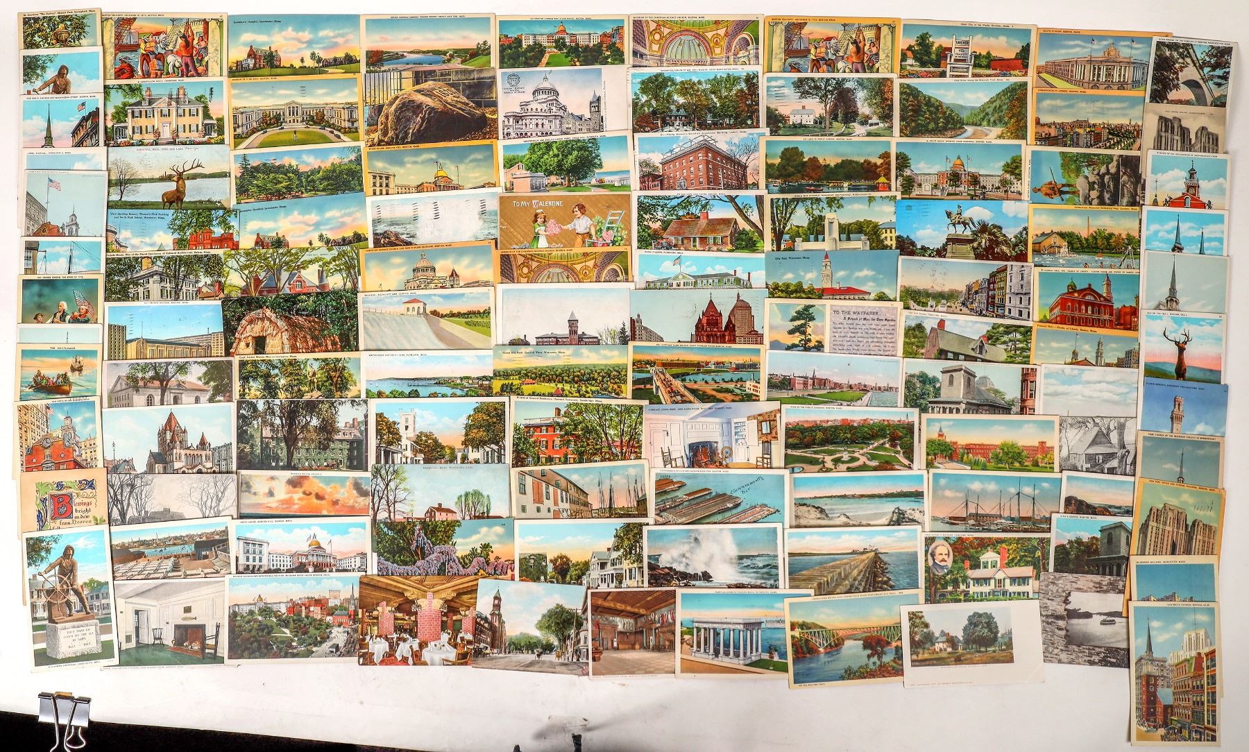 Lot of 90+. Mostly wht. border and some borderless. Few linen era cards by Curteich & Co. and Tichnor Bros.. One Pvt. Mail Card, two embossed cards. Postmarks : Dover N.H., Boston, North Chicago Ill., South Royalston MA., Worchester MA., Woonsocket R.I., Haverhill MA. and more. Stree level i.e; Gov't bldg's, churches, schools, harbors, English Wigwam village, George Washington Monument, World War Memorial, Statue of Capt. Parker, Fisherman's Memorial, Steamer Merrimac Haverhill, Paul Revere's House interior. Birdseye i.e; Cottage Park Bridge, Green Hill Park Worchester, Yacht Club Plymouth Massachusetts 1907-44. Ken Prag Collection