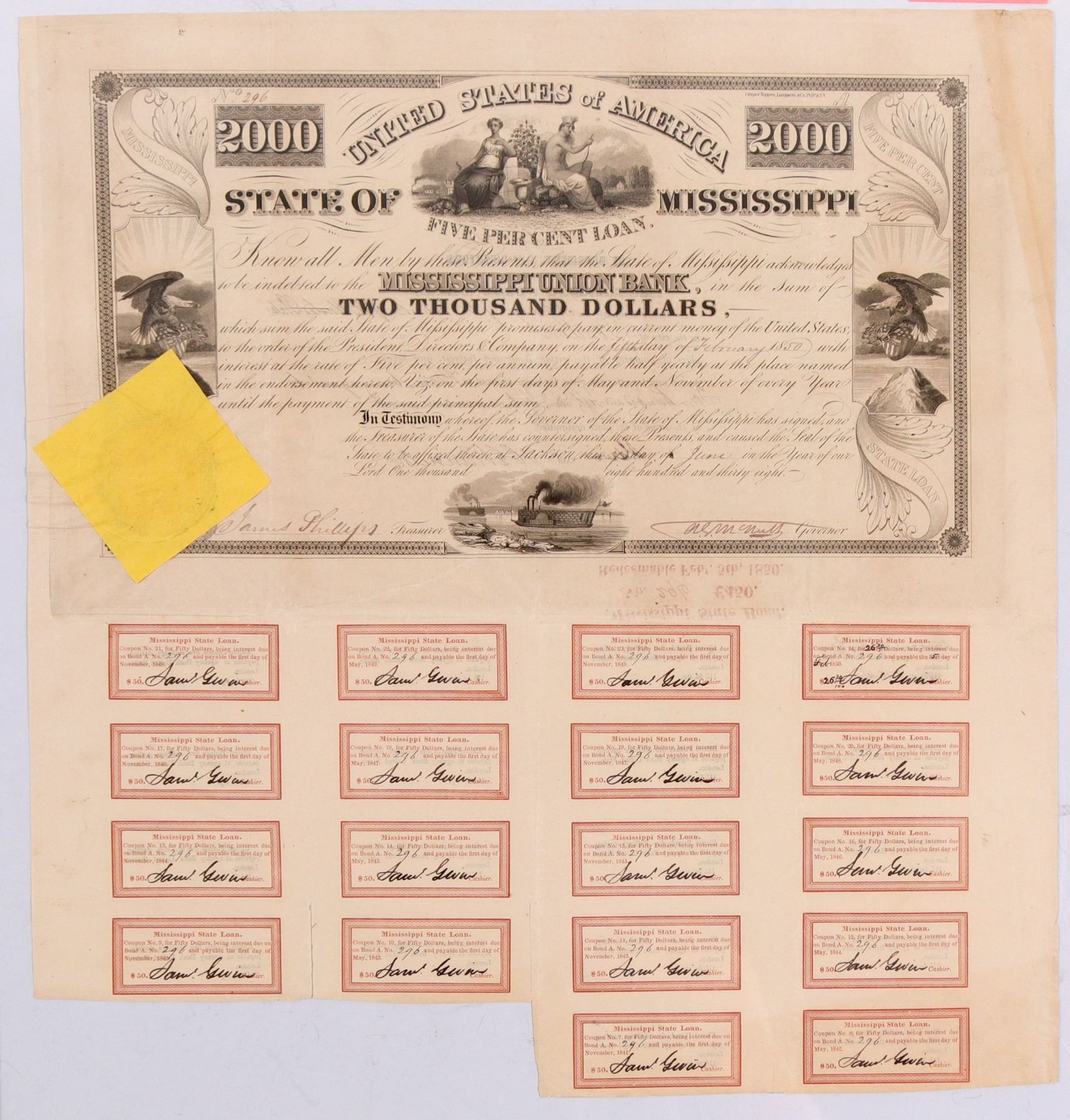 Mississippi Union Bank $2,000 5% loan payable Feb 5, 1850 . 18 coupons 15" x 14 12". Assigned. Mississippi Union Bank loan. Vignettes: 1) top center 2 Allegorical people (man and women) seated with town in background 2) left - eagle in flight with American flag shield and flower with "Mississippi" written 3) right - eagle in flight with American shield with flower saying "state loan 4) bottom center - 2 steam boats on body of water - 1 in front and 1 in background. Back of certificate designates agency of Bank of the US in London place payment and interest and guarantee payment.