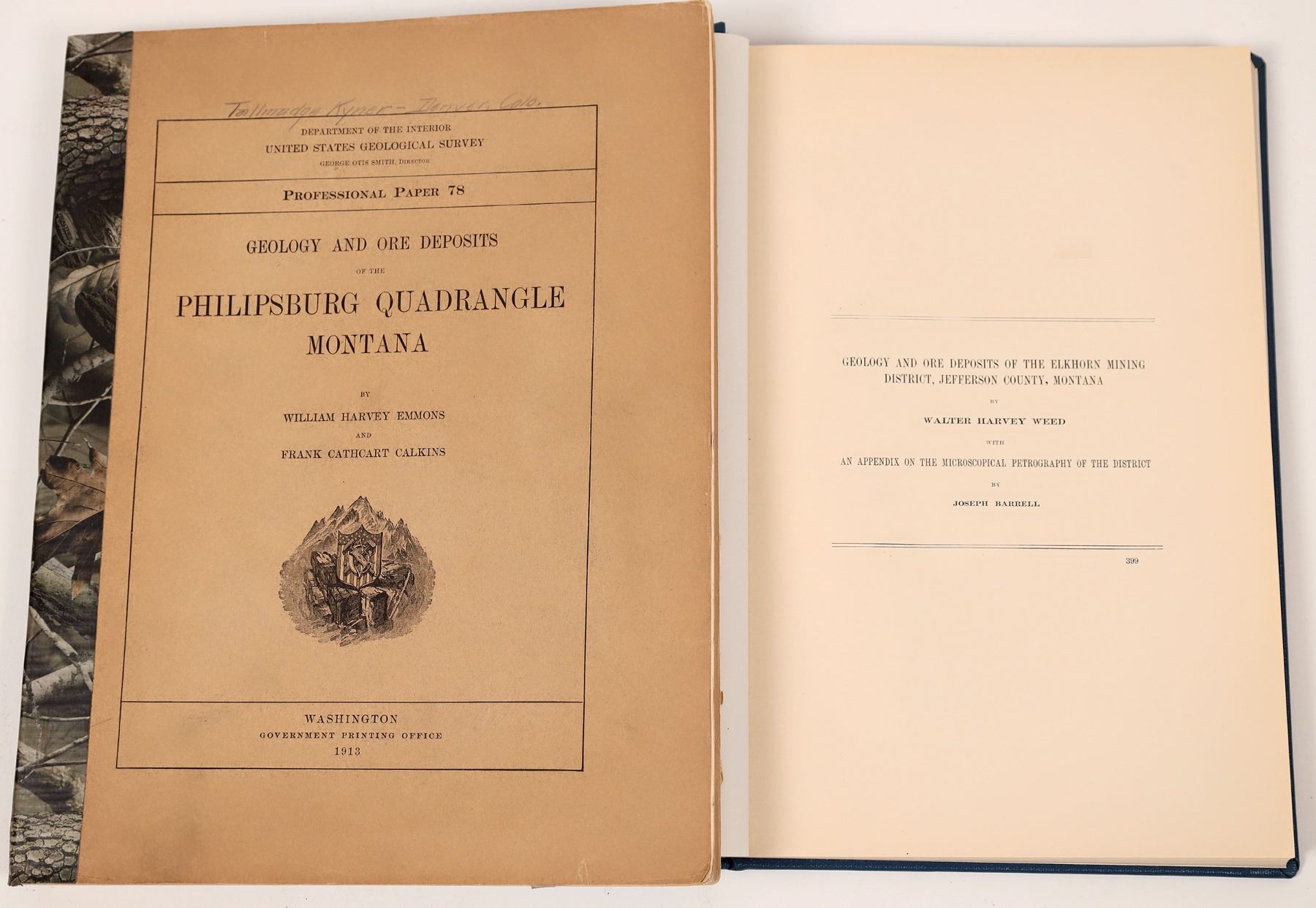 1) Geology & Ore Deposits of the Elkhorn Mining District Jefferson Co., 22nd Ann. Report, Part II, by Walter H. Weed 21 plates, (2 in pocket), 7 figures - (7 .5"x 11 .5", HB, 150 pgs.) 2) Geology & Ore Deposits of the Philipsburg Quadrangle, 1913, by Wm. H. Emmons & Frank Calkins 17 plates, 55 fig. (9"x 11 .5"SC, 271 pages)