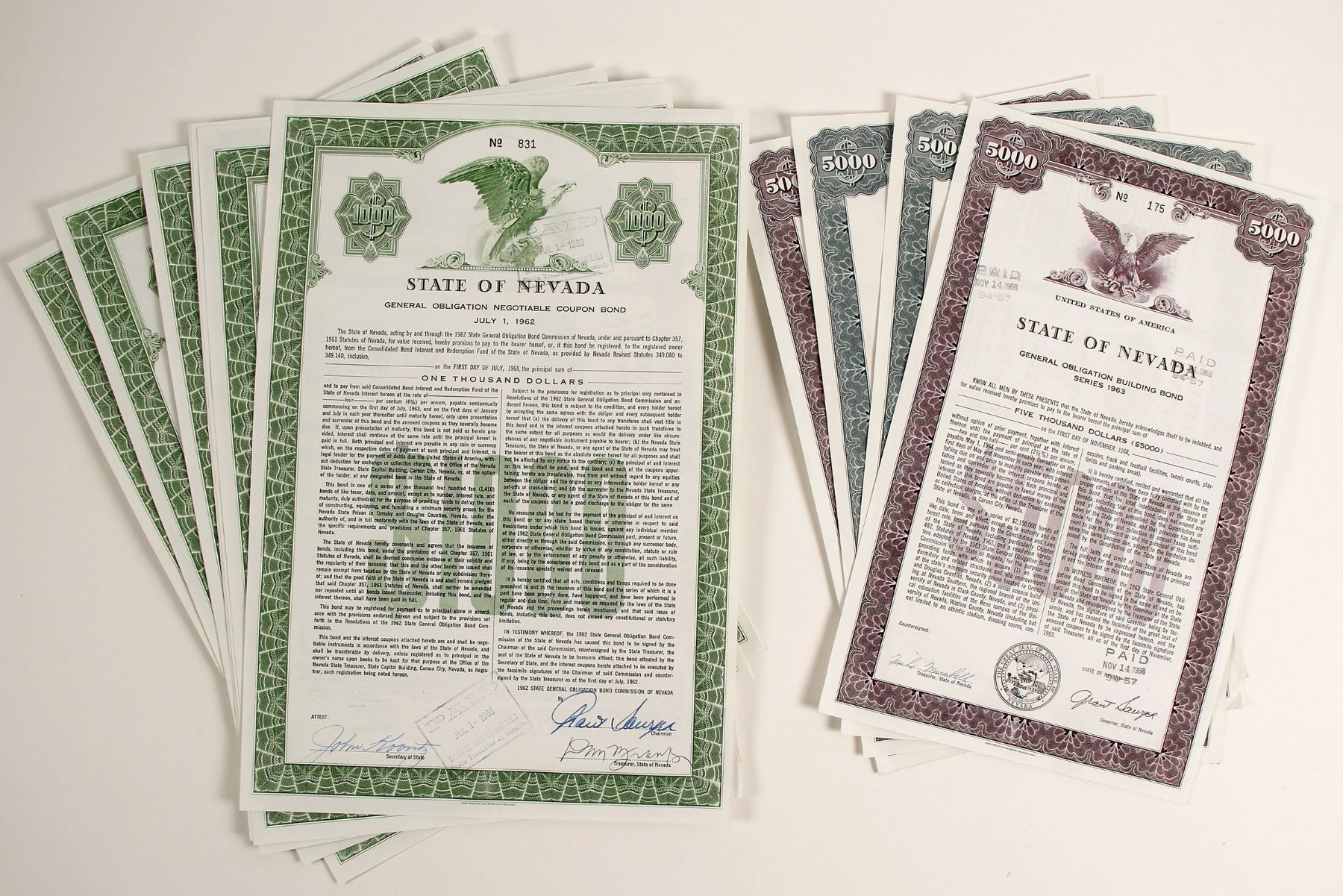 14 state of Nevada bonds, one 1920, 1962 and 1965, Governor Sawyer signatures. All paid City: State: Nevada Date: