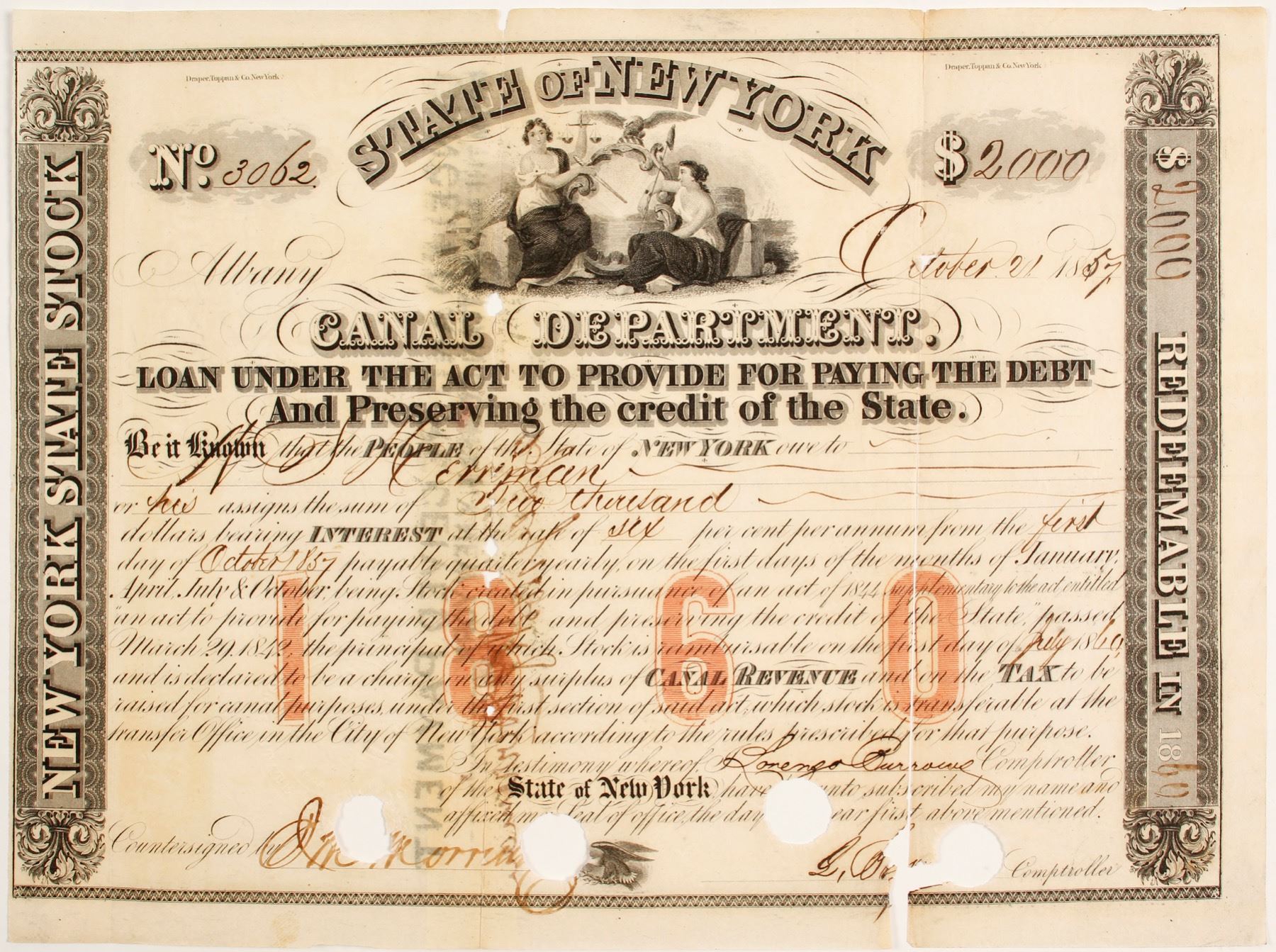 I/C #3062 $200 6%. Punch cancelled, bottom tear. Allegorical vignette. Prag Collection. State: New York City: Date: 1857 HWAC# 83407