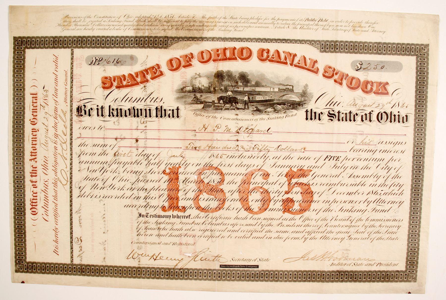 Rare. I/U #616 HP D? $250 1865. 25c revenue stamp on back. Nice canal, barge and train vignette. Raised money for Ohio canals.Several tears and small hole, please inspect, sold as is. Prag Collection. State: Ohio City: Date: 1865 HWAC# 83459