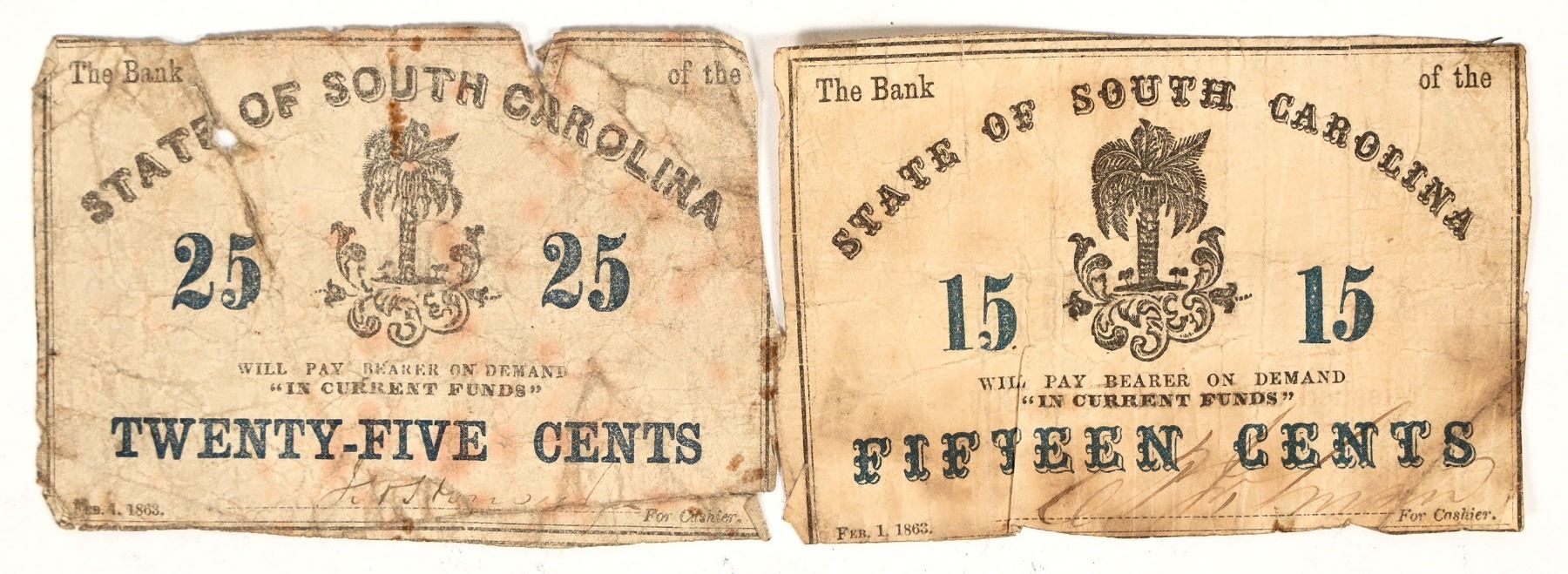 Two fractional currency notes from the Bank of the State of South Carolina issued in 1863: fifteen cents and twenty five cents. Each 4 x 2 1/2 inches, well circulated.