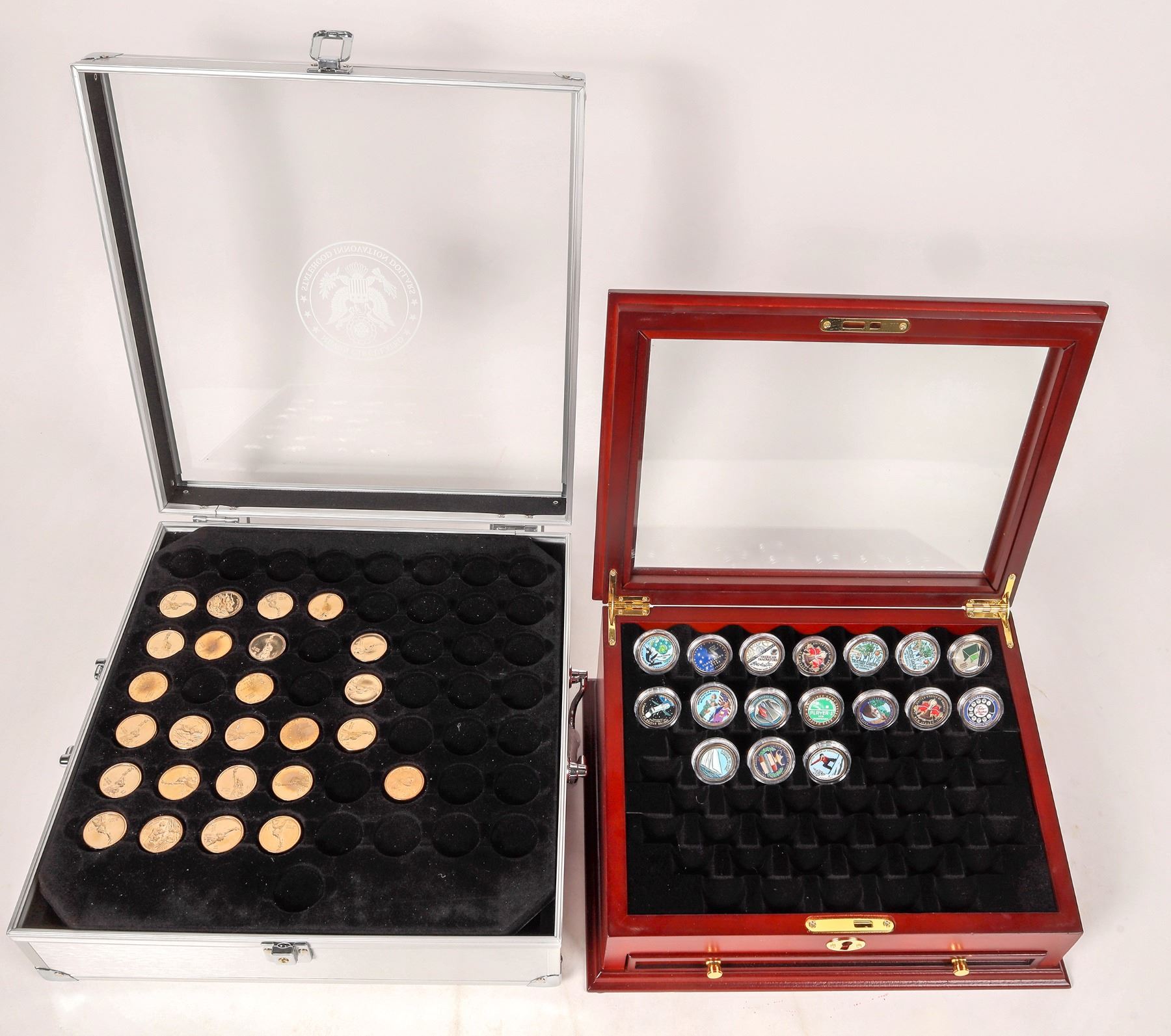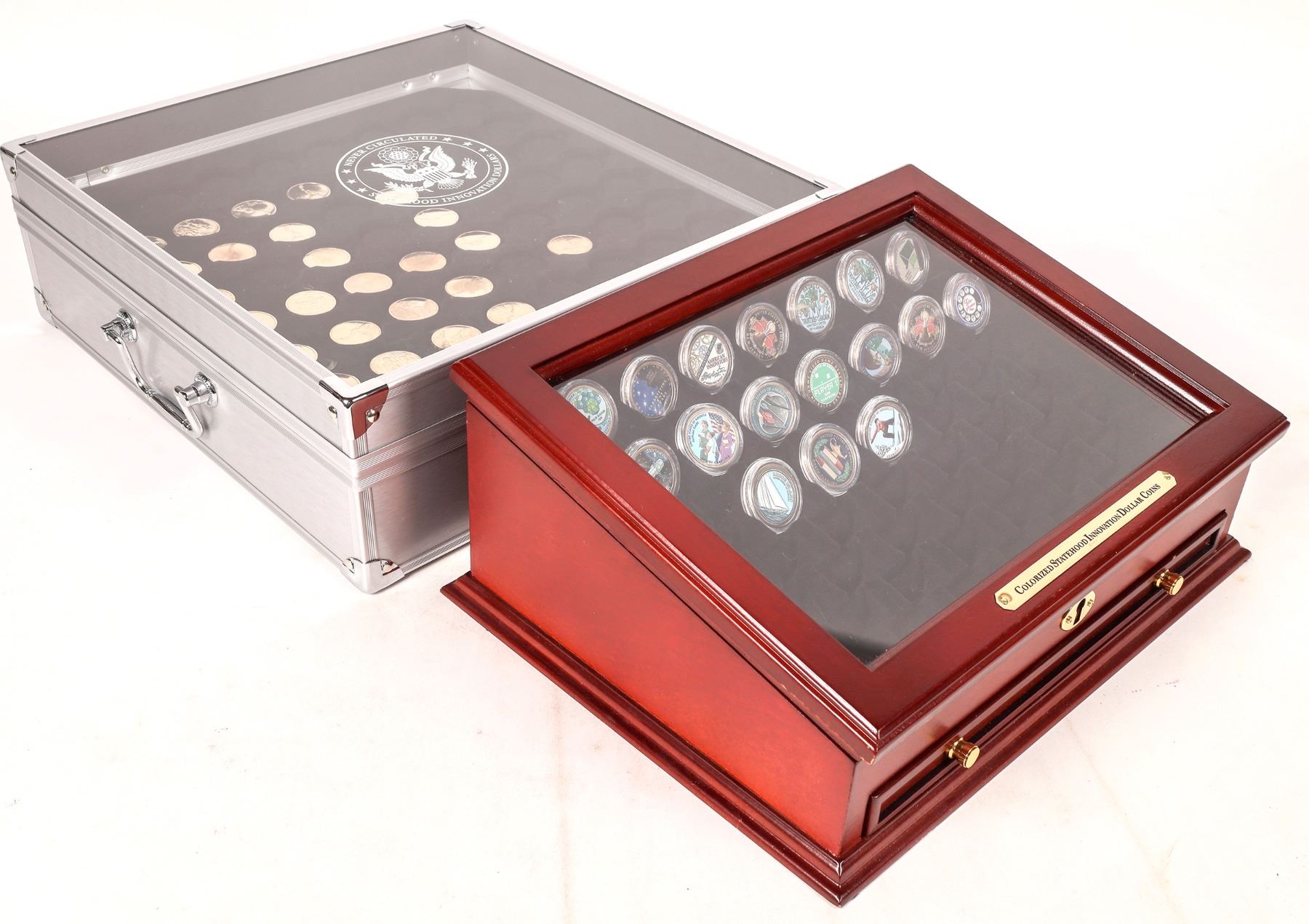Two display cases for State Innovation Dollar coins. 1) Issued by the Danbury Mint: aluminum, glass topped case, with 25 coins, room for rolls on the bottom shelf. Case is 13 x 4 x 4 inches, with handles. 2) PCS Stamps and Coins: Colorized Statehood Innovation Dollar Coins. Glass topped wooden case (12 x 10 x 5 inches) with 17 coins.