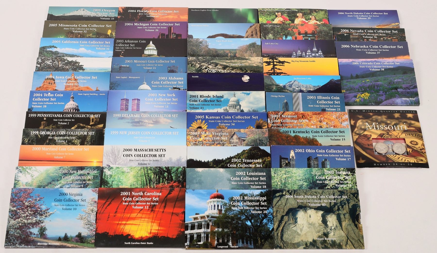 Elegant presentation by the Burnett Company of the United States state quarter commemorative quarters. Each colorful glossy case has a slide out insert with and uncirculated state quarter, information about the state and more colorful pictures. 48 of the 50 states are here, missing only Volume 5 (Connecticut) and Volume 23 (Maine).