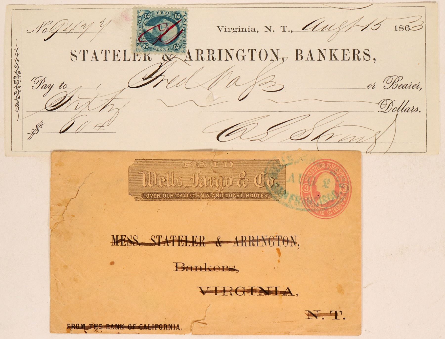 Lot of 2. 1) Rare Wells, Fargo & Co. cover with San Francisco cancel sent to Mess. Stateler & Arrington, Bankers, Virginia, N.T. from the Bank of California. Latter text is preprinted on the envelope and has been crossed out. Cover has big condition issues as it was removed from an album. 2) 1863 check for the bank, dateline Virginia, N.T. from Charles Strong (supt of the Gould & Curry Mining Company). Stateler & Arrington were backed by the Bank of California. Their primary client was the Gould & Curry Mining Company. Stateler caused the bank to fail in 1864 after suspiciously trying to cash two large drafts from Wells Fargo (who provided the gold coin to cover the mine pay roll). William Ralston denied the second draft from going through, and Stateler closed the bank doors, defaulting on ~$20,000 owed Wells Fargo and $30,000 owed the Bank of California. To recoup their losses, the Bank of Cal. dispatched William Sharon to the Comstock, thus beginning the bank's eventual path to a monopoly.