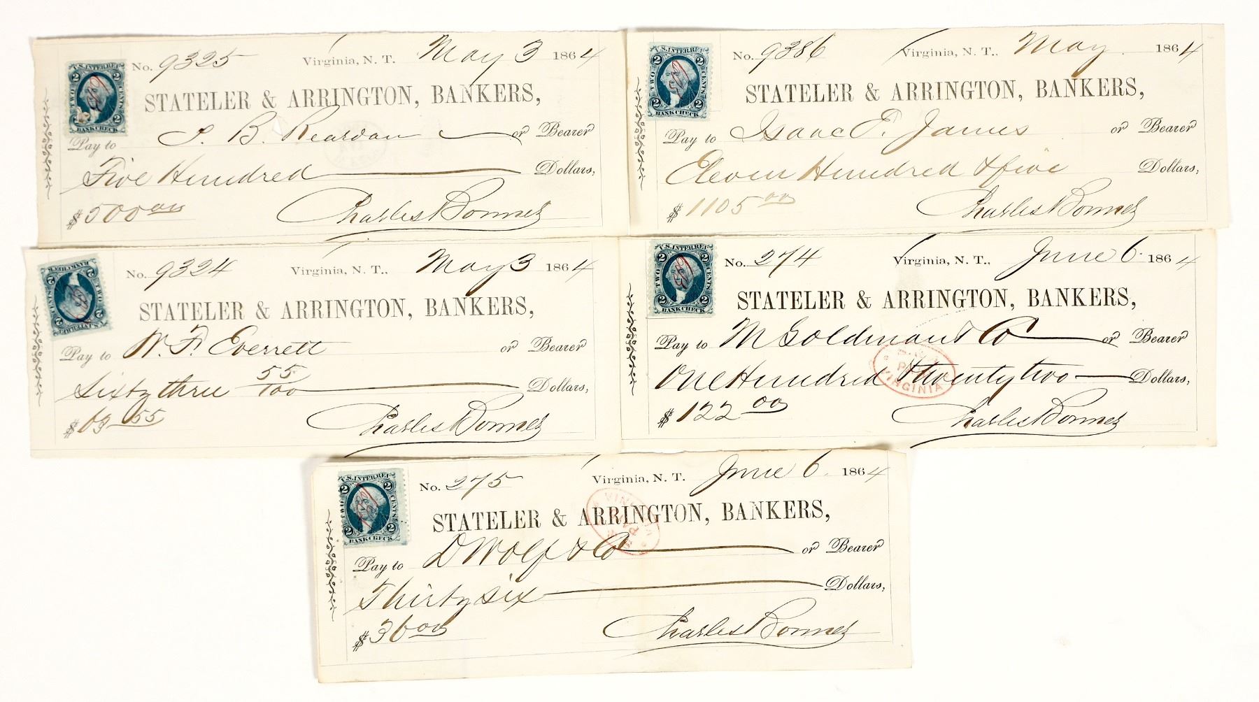 Stateler & Arrington, Gould & Curry, Virginia City, Nevada Territory Check Group (5) [199186]