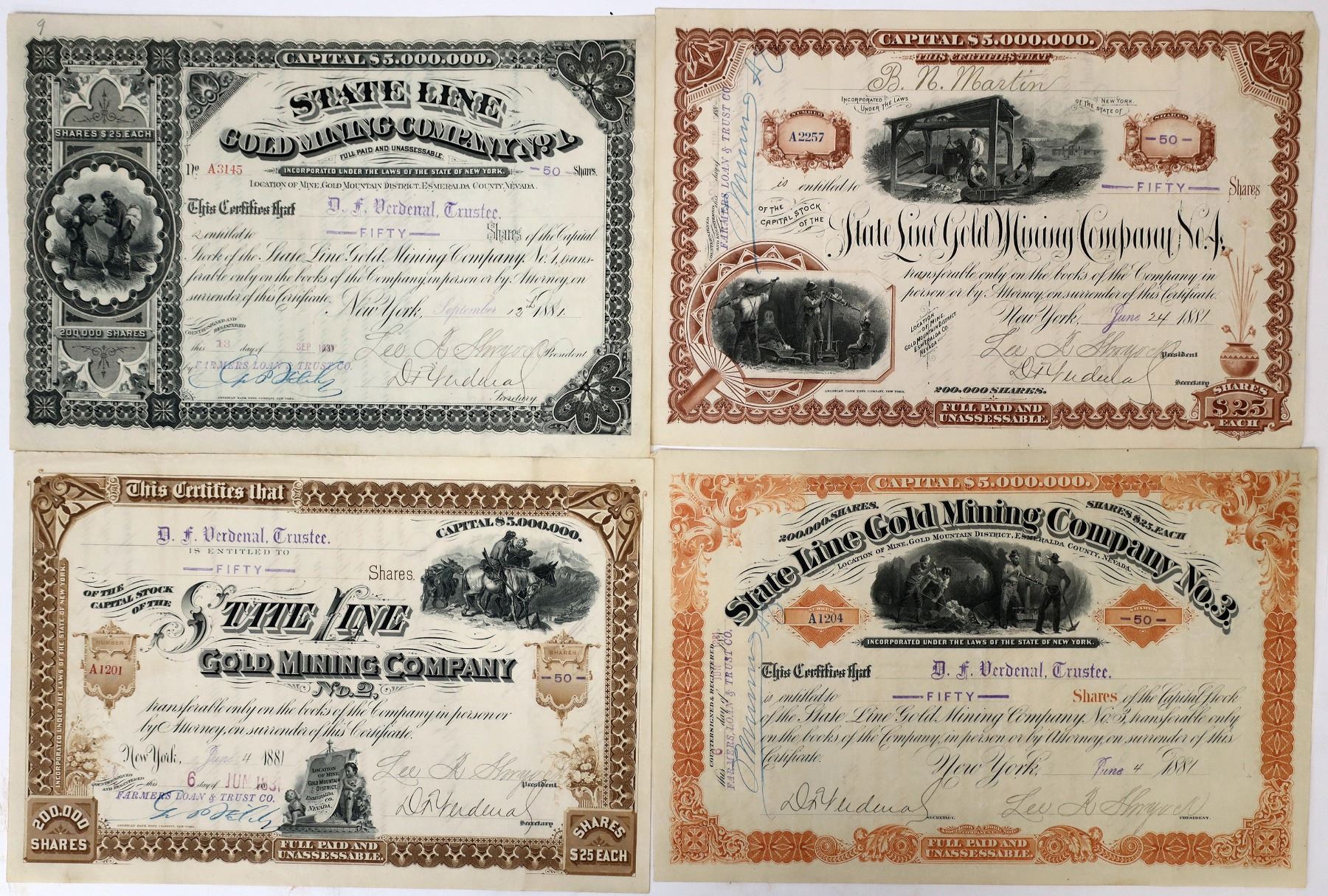 Nice collectible set of all four State Line Gold Mining Stocks. Includes State Line GMC #1, State Line GMC #2, State Line GMC #3, and State Line GMC #4. #1 A3145 for 50 shares to D. F. Verdenal. Vignette of two miner sharing gold. #2 A2101 for 50 shares to Verdenal. Vignette of an old prospector on a horse. # 3 A1204 for 50 shares to Verdenal. Vignette of underground miners. #4 A2257 for 50 shares to B. N. Martin. Two vignettes: underground mining with pneumatic drill and miners hoisting ore up from a shaft. All issued in 1881. All are signed by Verdenal as president and Lee R. Shyrock as secretary. All four were issued in 1881 and have different vignettes. Location of mines was located at Thorp in the Gold Mountain mining district, Esmeralda County, Nevada. All four certificates are in very good condition and are uncanceled. American Bank Note Company, New York. Not profitable and seems to be a fraud!