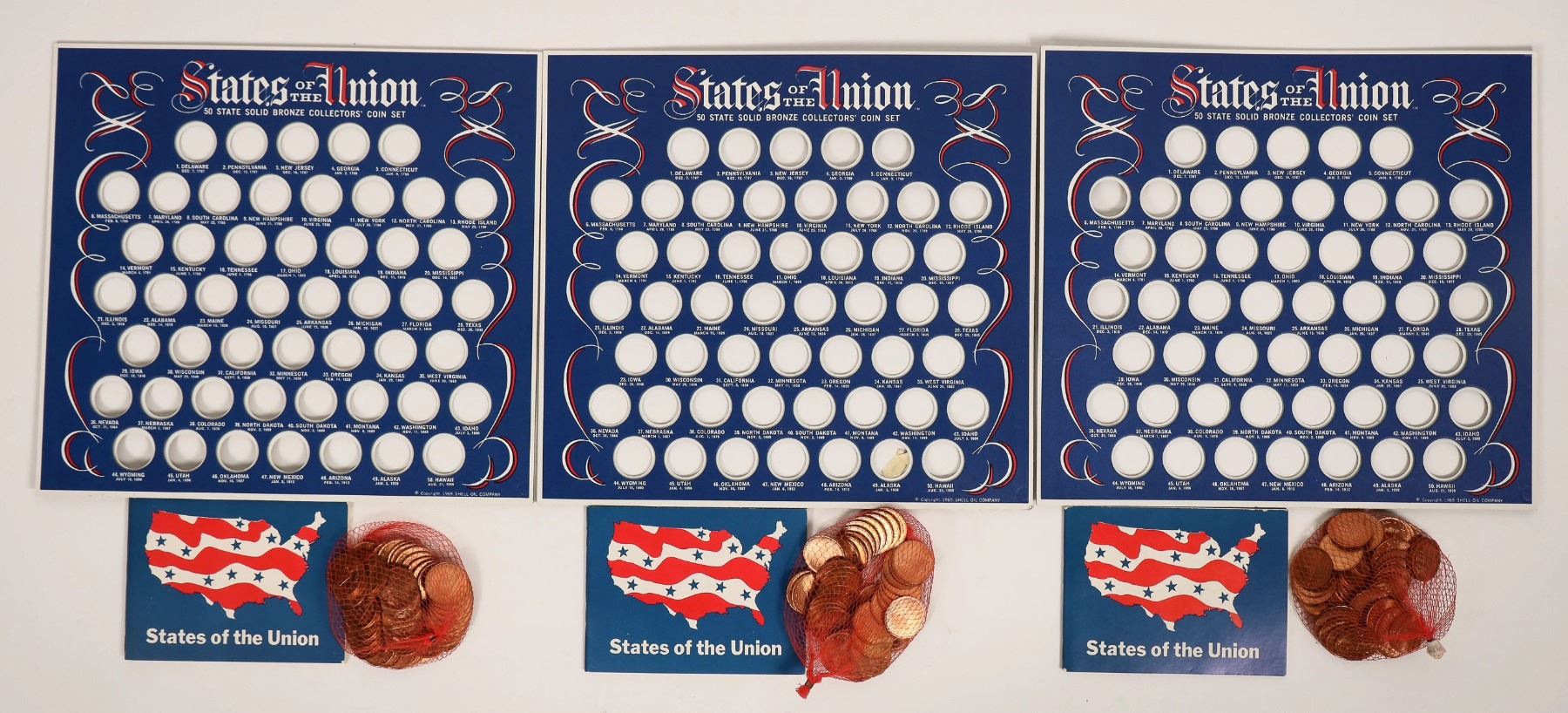 Copyright 1969 by Shell Oil Company. Three brand new sets with a bag of 50 bronze coins of each of the United States, a 12 x 10 inch cardboard holder for them, and brochure with historical information on each state. In original envelopes.