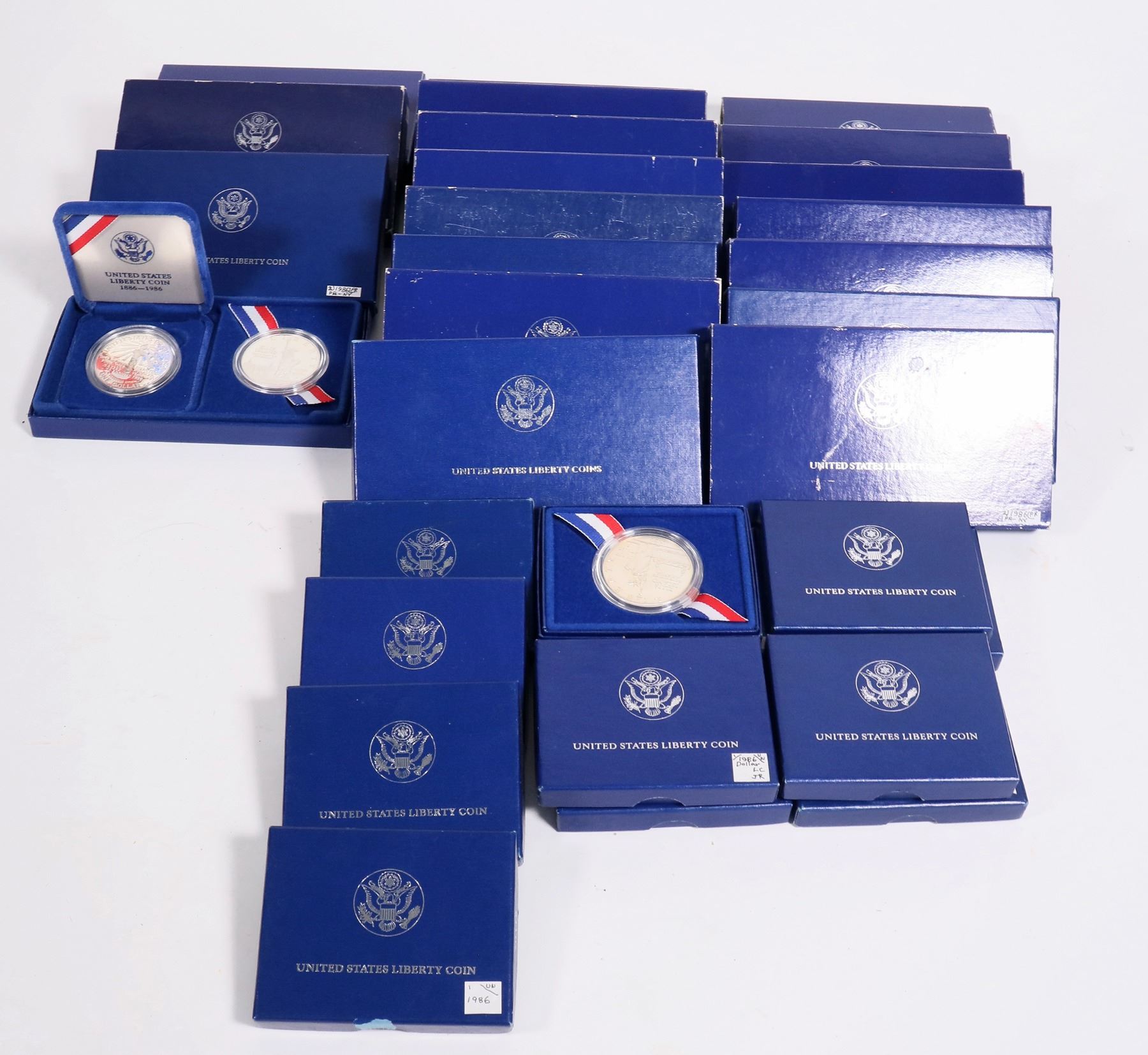 In original mint packaging. Designed by John Mercanti, this .900 fine silver dollar commemorates Ellis Island as the "Gateway to America." The U. S. Mint made four different issues: Silver Proof One Dollar coin (3); Silver Proof One Dollar & clad half dollar (16); Uncirculated silver dollars (6); and uncirculated clad half dollars (6). 1986