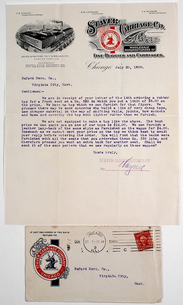 Correspondence dated July 20, 1908, from the Staver Carriage Co. of Chicago, IL, to Buford Mercantile Co. of Virginia City, MT. Includes the envelope printed with the red and blue Staver logo and the typewritten letter with blue and red letterhead answering a request from Buford Mercantile for a rubber top for the front seat of a Number 335 wagon. Date: 1908 Location: Virginia City, Montana HWAC# 64221