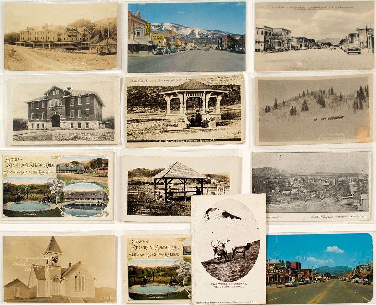 A collection of 13 different Postcards from Steamboat Springs, Colorado. 3 early RPC (c. 1910), 2 late RPC, 6 early PC (c. 1910), 2 late PC. (Prag Collection) City: Steamboat Springs State: Colorado Date: ID# 32357