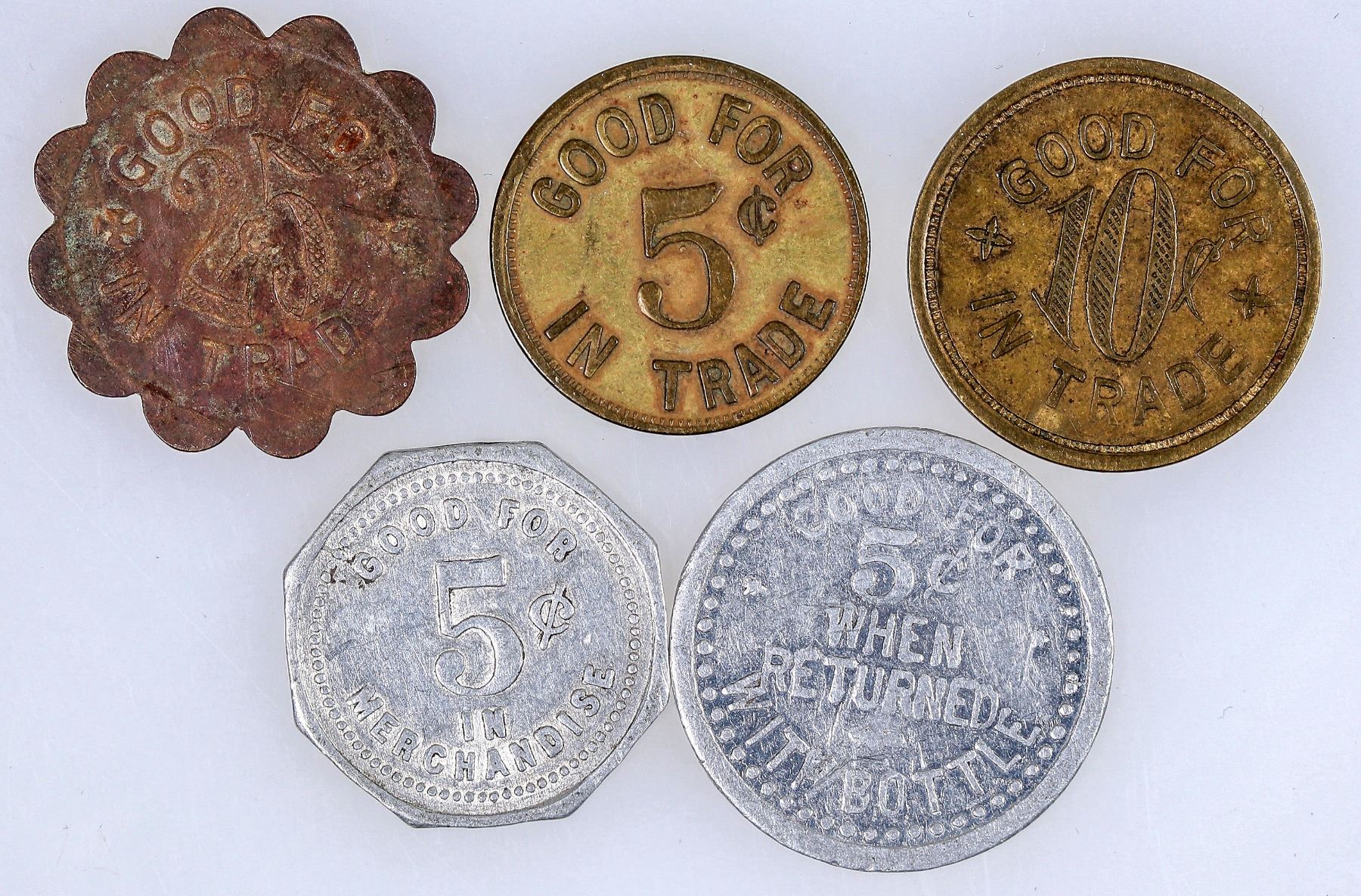 Lot of five tokens from Steamboat Springs: R. L. Wyatt (2: GF 10 & 25 cts); Pioneer Hotel Cafe; Steamboat Creamery; Recreation Hall.
