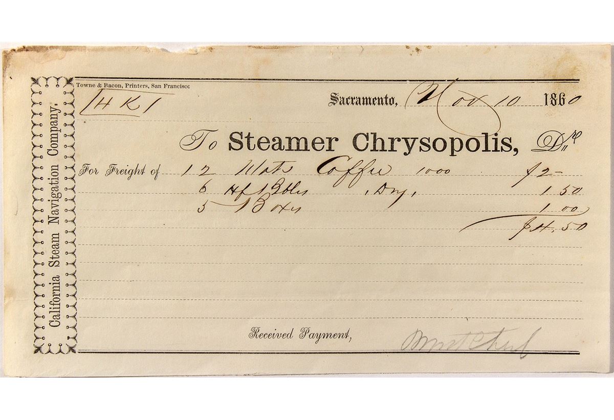 Freight bill receipt from the Steamer Chrysopolis, the Sacramento River's most glamorous paddle wheeler (California Steam Navigation Company), ran during Gold Rush era. The Chrysopolis was the finest on the inland waters of the Pacific Coast. It went up to Sacramento well loaded with live freight, as well as a goodly quantity of merchandise, and nearly five hundred passengers, and three hundred and fifty tons of freight.