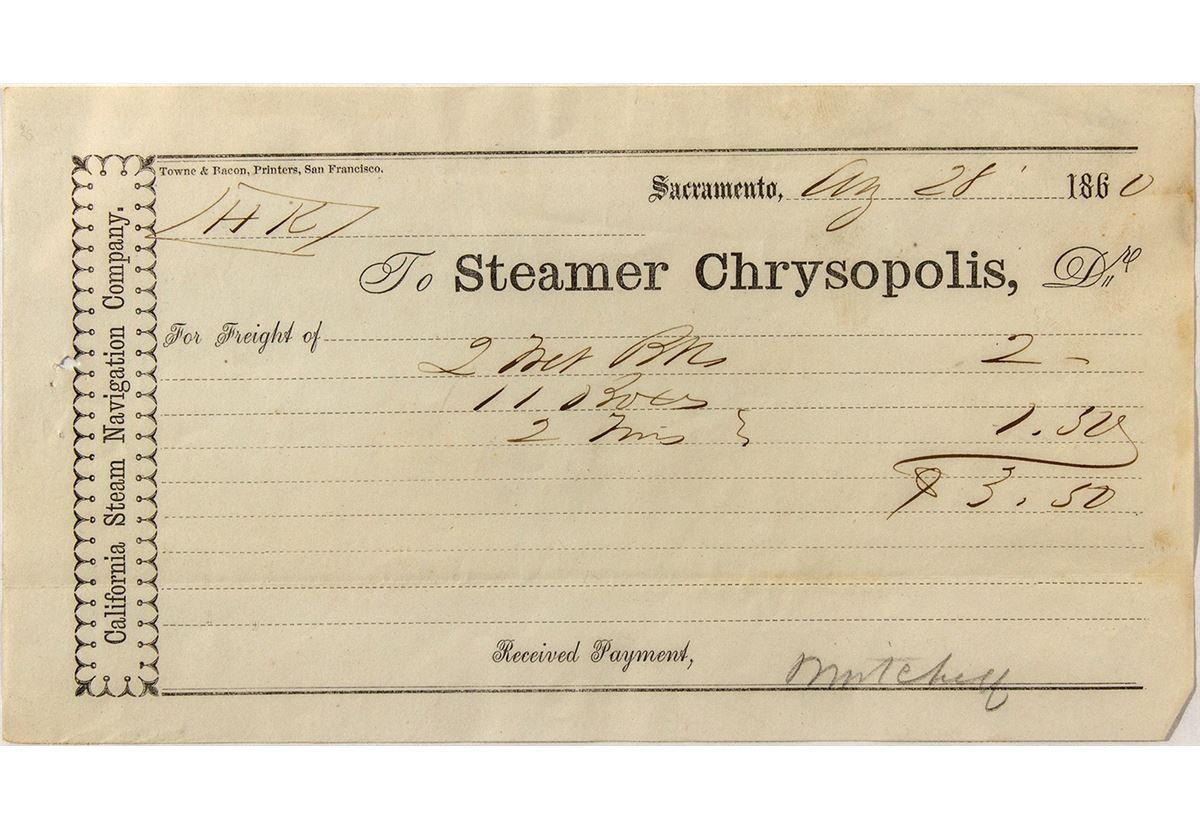 Freight bill receipt from the Steamer Chrysopolis, the Sacramento River's most glamorous paddle wheeler (California Steam Navigation Company), ran during Gold Rush era. The Chrysopolis was the finest on the inland waters of the Pacific Coast. It went up to Sacramento well loaded with live freight, as well as a goodly quantity of merchandise, and nearly five hundred passengers, and three hundred and fifty tons of freight.