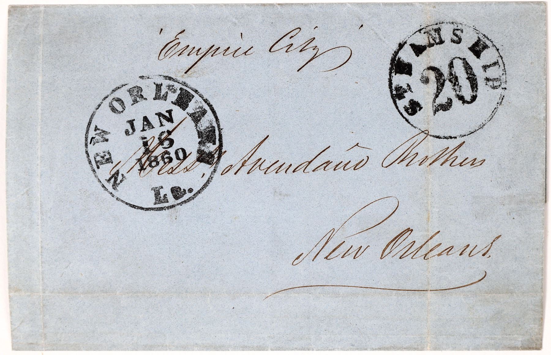 Manuscript Empire City. Postmark New Orleans, Jan 16, 1860, La. Cancelled with circular Steamship 20. Once it reached New York (presumably) it was sent to Cuba. Reverse has a Habana oval cancel! (Milgram 417).