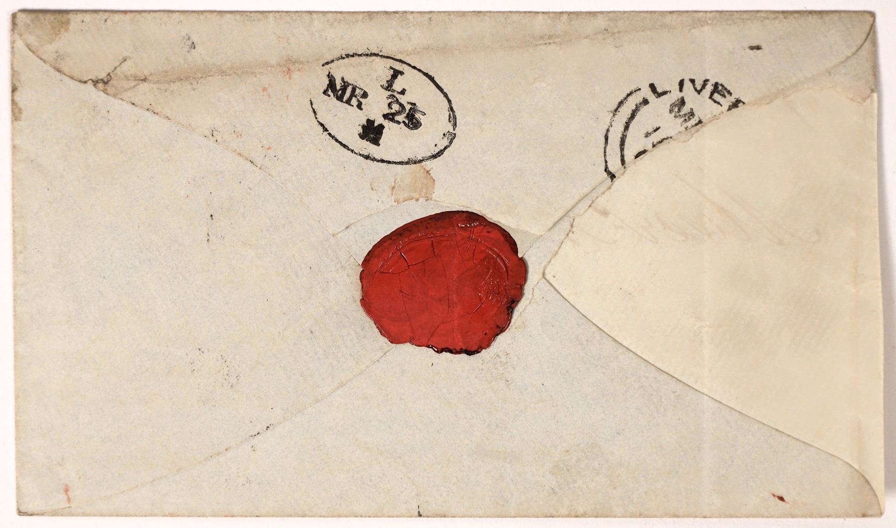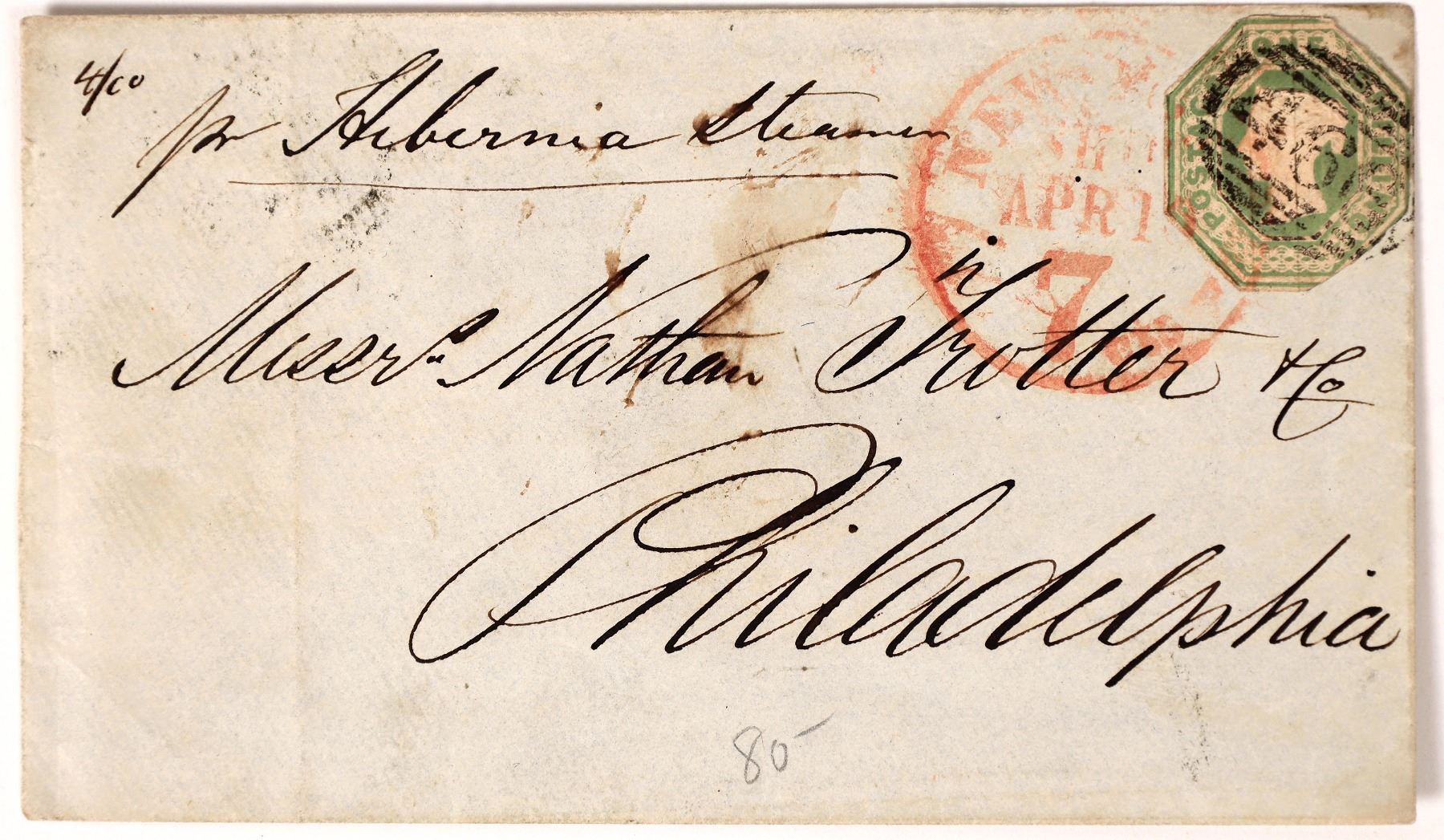 This is an Atlantic Ocean steamer. Manuscript Hibernia Steamer top center. Liverpool to New York to Philadelphia. C1841. Octagonal 8 sided English ONE (pound?) stamp. (Milgram, 606)