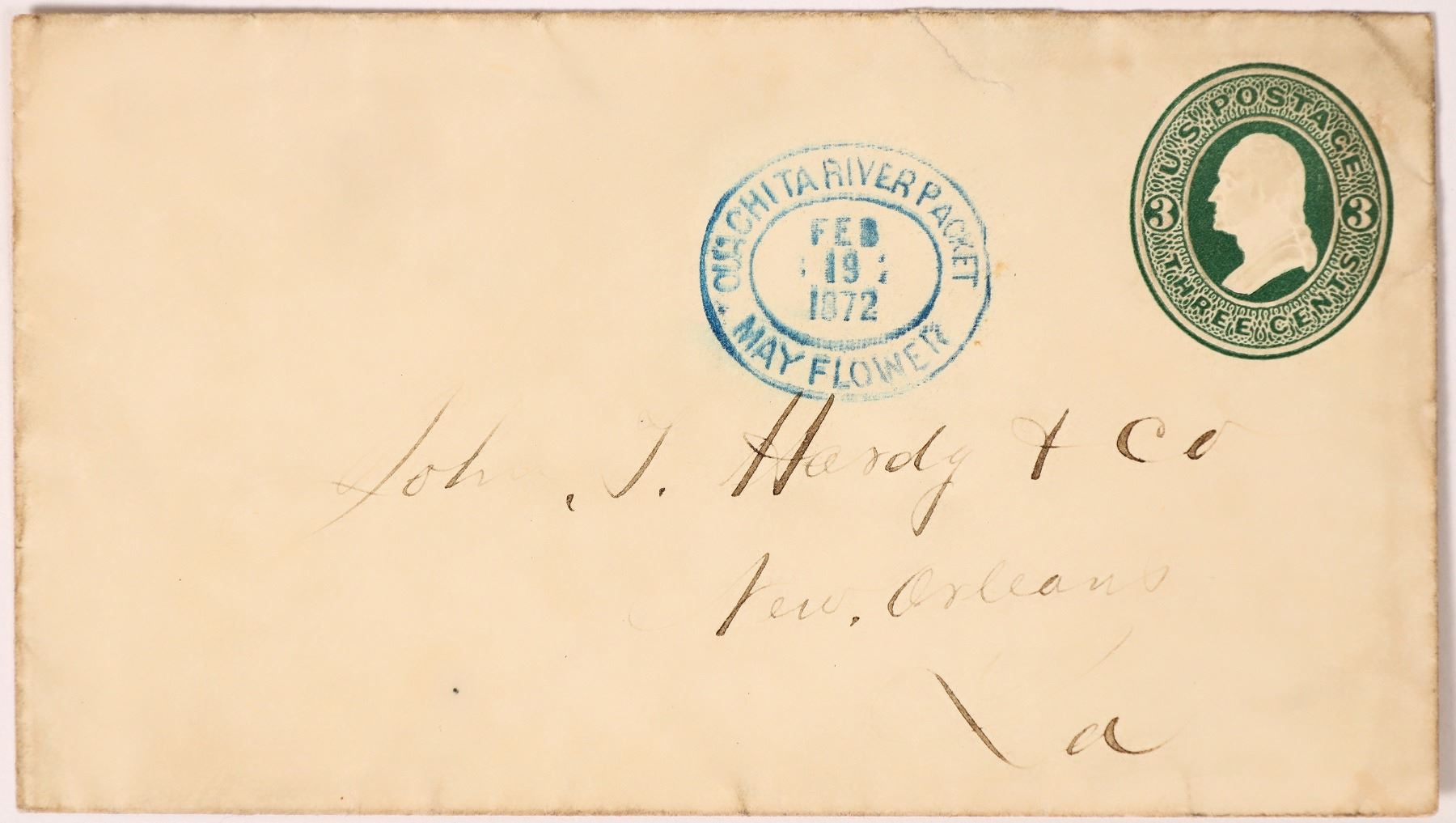 Nice blue oval stamp reads Quachita River Packet, Feb 19 1872, Mayflower. On three cent entire and sent to New Orleans. (Milgram, 878)