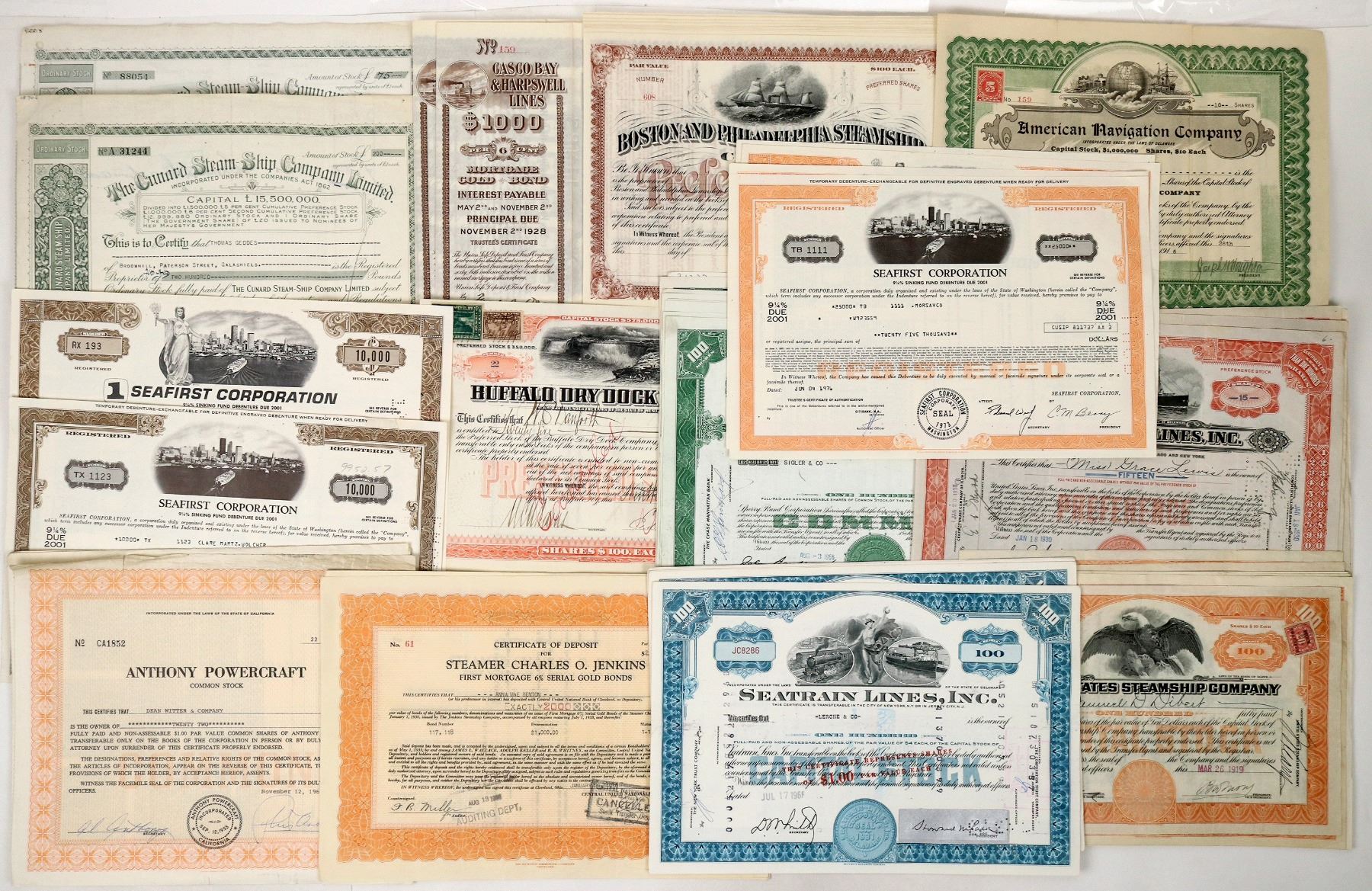 All issued. 5x 1976-77 Seafirst with 1 brown, 5x 1968 blue Seatrain Lines, 5x 1934-36 Steamer Charles O Jenkins, 13x 1918-19 United States Steamship, 4x 1930 United States Lines, 4x 1960-62 Anthony Powercraft, 1x 1977 Seafirst, 1x 1916 American Navigation, 1x 1899 Buffalo Dry Dock, 1956 and 1961 Cunard Steamship. Unissued-13x 1890's Boston and Philadelphia Steamship. 2x 1908 Casco Bay & Harpswell Lines $1000 bonds.
