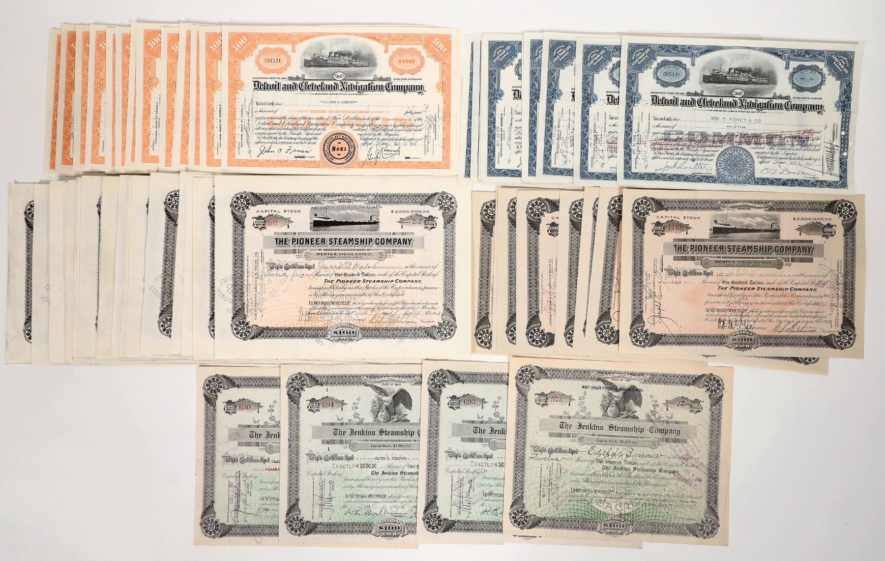 Approximate quantities. Issued-40x 1913-23 Pioneer, 5x 1917-30 Jenkins, 20x 1944-54 Detroit and Cleveland Navigation in blue and orange.
