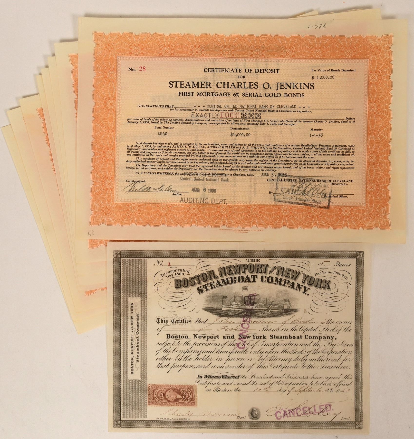 Lot of 9. 1-8) Certificate of Deposit for Steamer Charles O. Jenkins. First Mortgage 6% Serial Gold Bonds. No, 28, 30-36. Jenkins Steamer company built and operated freight steamers. 9) I/C #1 John Gardner 5 shares 1863. Steamer Metropolis vignette. Inc In MA. Signed by President Jabey? 25c revenue stamp. "The Bay State Steamboat Company was chartered in 1846, and operated regular service from New York to Fall River. The route retained the name "Fall River Line" through several changes of ownership. This connected to rail service from Fall River to Boston.