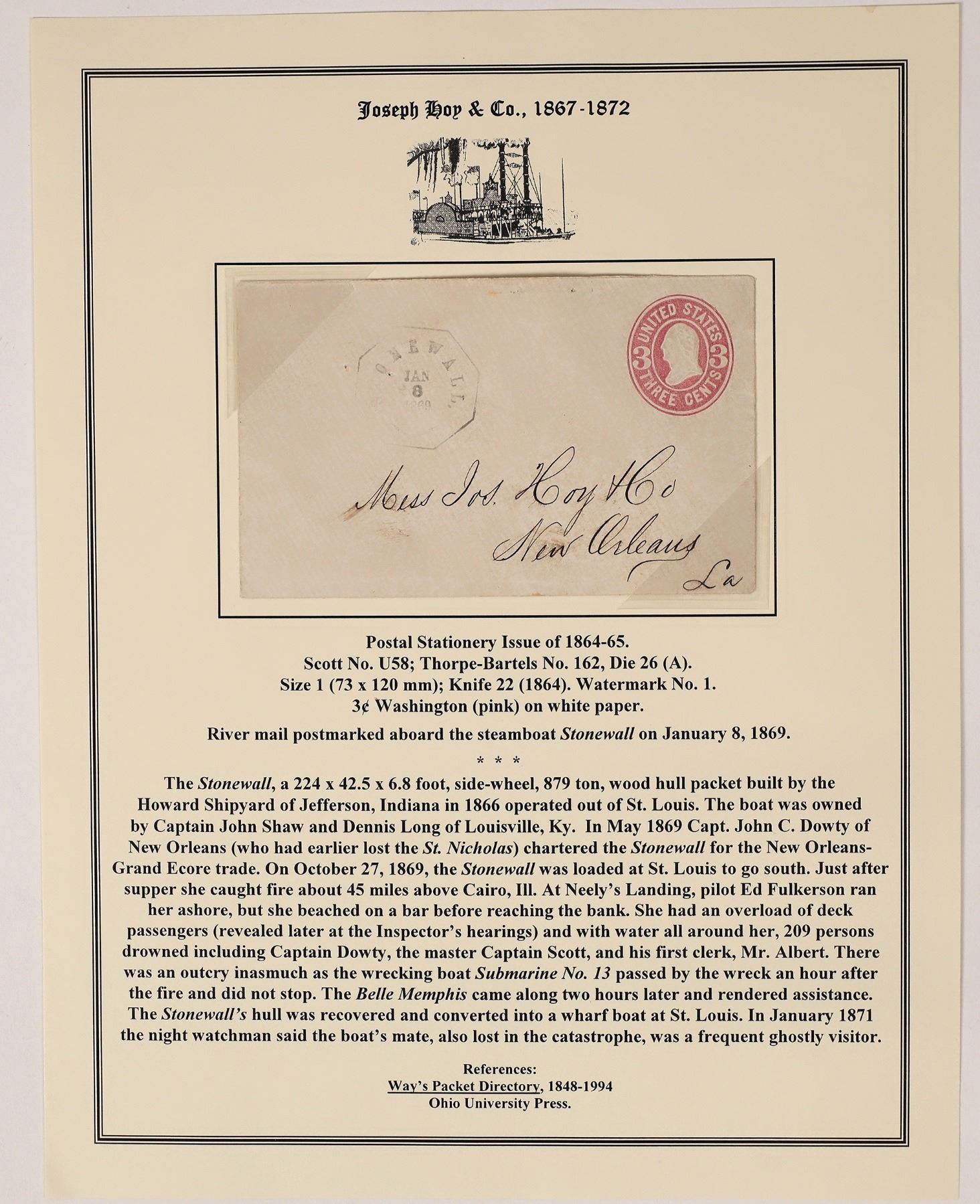 Scott U58. Issued 1864-65. Octagonal postmark dates the piece to 1869. Side wheeler. In May of 1869 Captain John C. Dowty of New Orleans chartered the Stonewall for the New Orleans-Grand Ecore trade. In October the Stonewall was scheduled to go south. She caught fire and beached. Postmark dated Jan 8, 1869. (Milgram, K-532a)