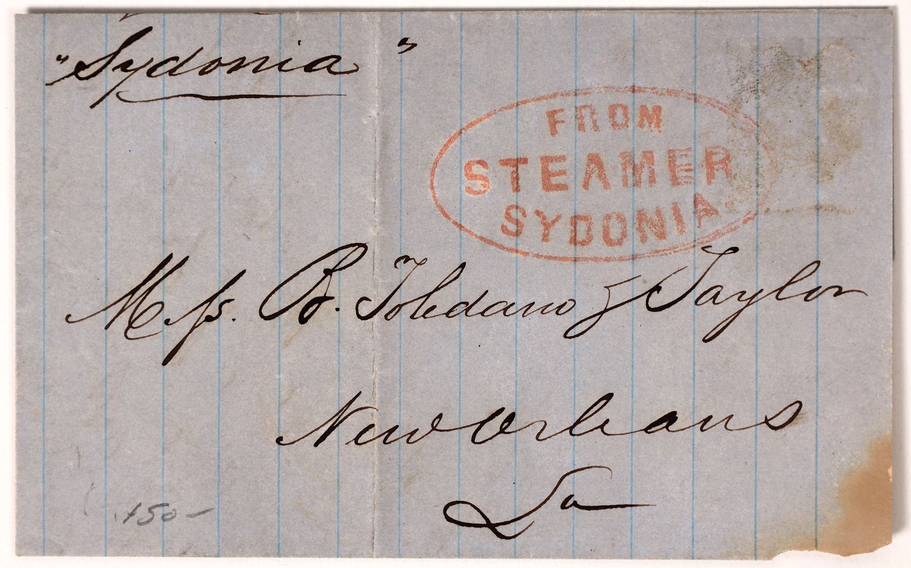 Stampless letter with 1855 from Washington. Asking for coffee-Bright orange 'From Steamer Sydonia'. To Toledano & Taylor Company. Sydonia ran the Red and Mississippi rivers. (Milgram 1342)