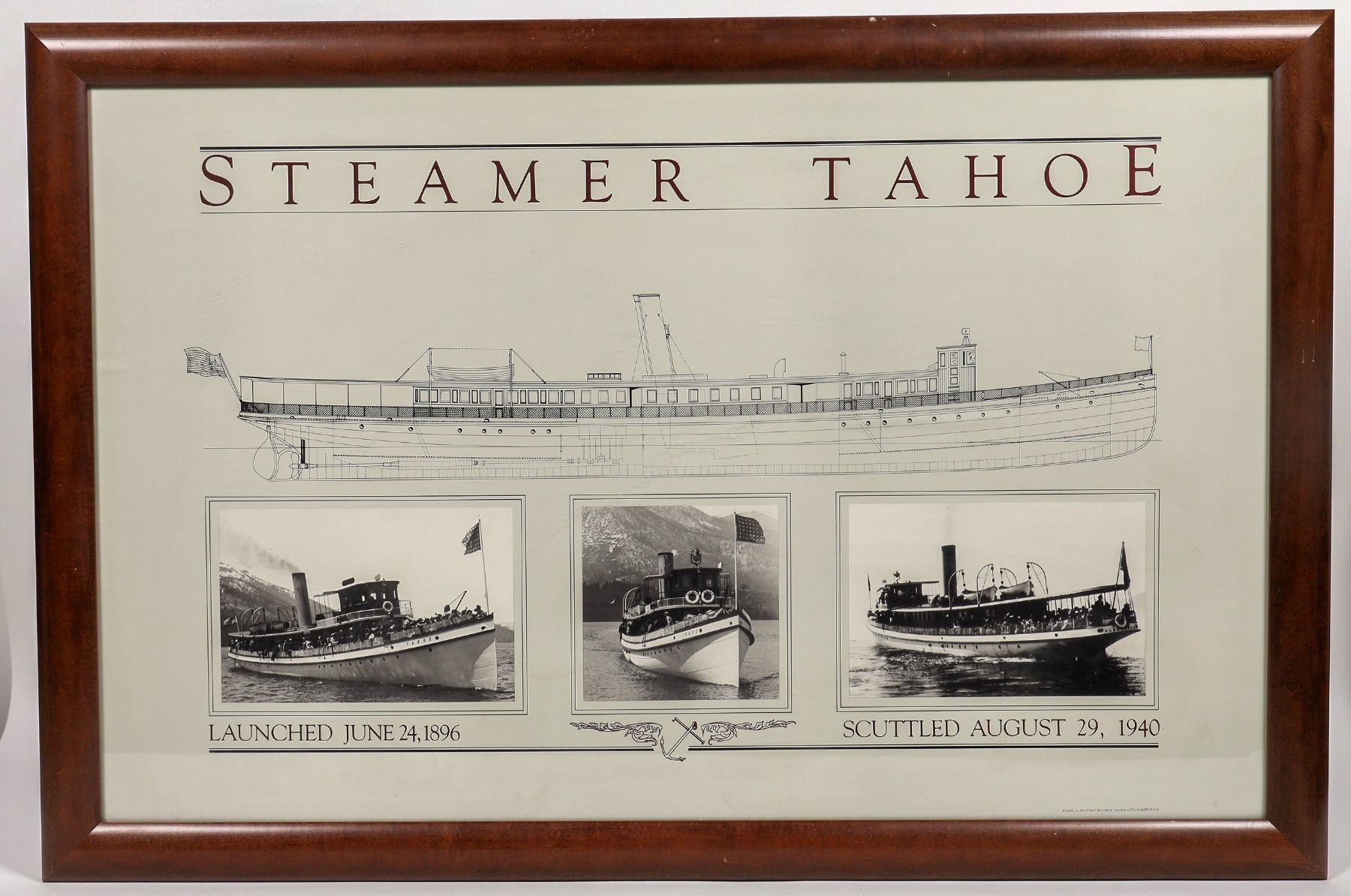Framed print of Steamer Tahoe, 1983 with 3 vintage photos and a mechanical drawing ot the steamer. Frame 26x39".