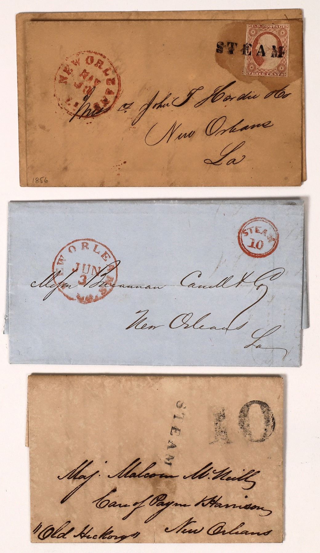 Lot of four. 1) 1837 stampless letter with short note. Postmarked New Orleans, June 3. Cancelled with a double ring Steam 10. 2) 1846 stampless letter with note to uncle. From Minneapolis to New Orleans. Steamer listed as Old Hickory in manuscript. Steam stamp and paid 10. Milgram lists Old Hickory c1847. 3) Stampless cover. Cancelled with STEAM. Sent to New Orleans. 4) Mississippi River steamer. Postmarked New Orleans. Sent to New Orleans. STEAM cancel. c1856.