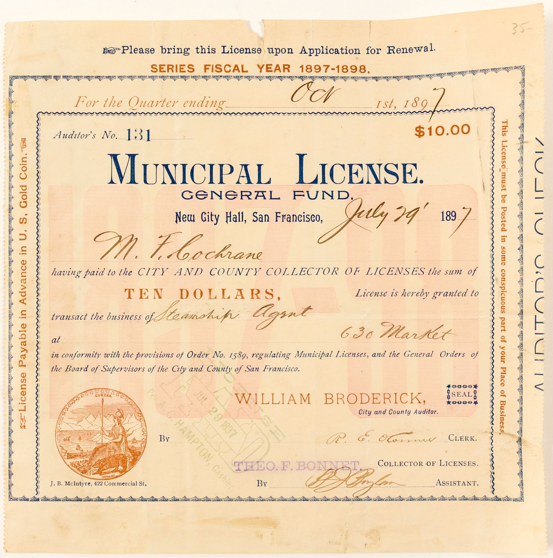 1897 steamship agent license in San Francisco. 1" left tear, top chip missing, water stain mostly visible on rear.