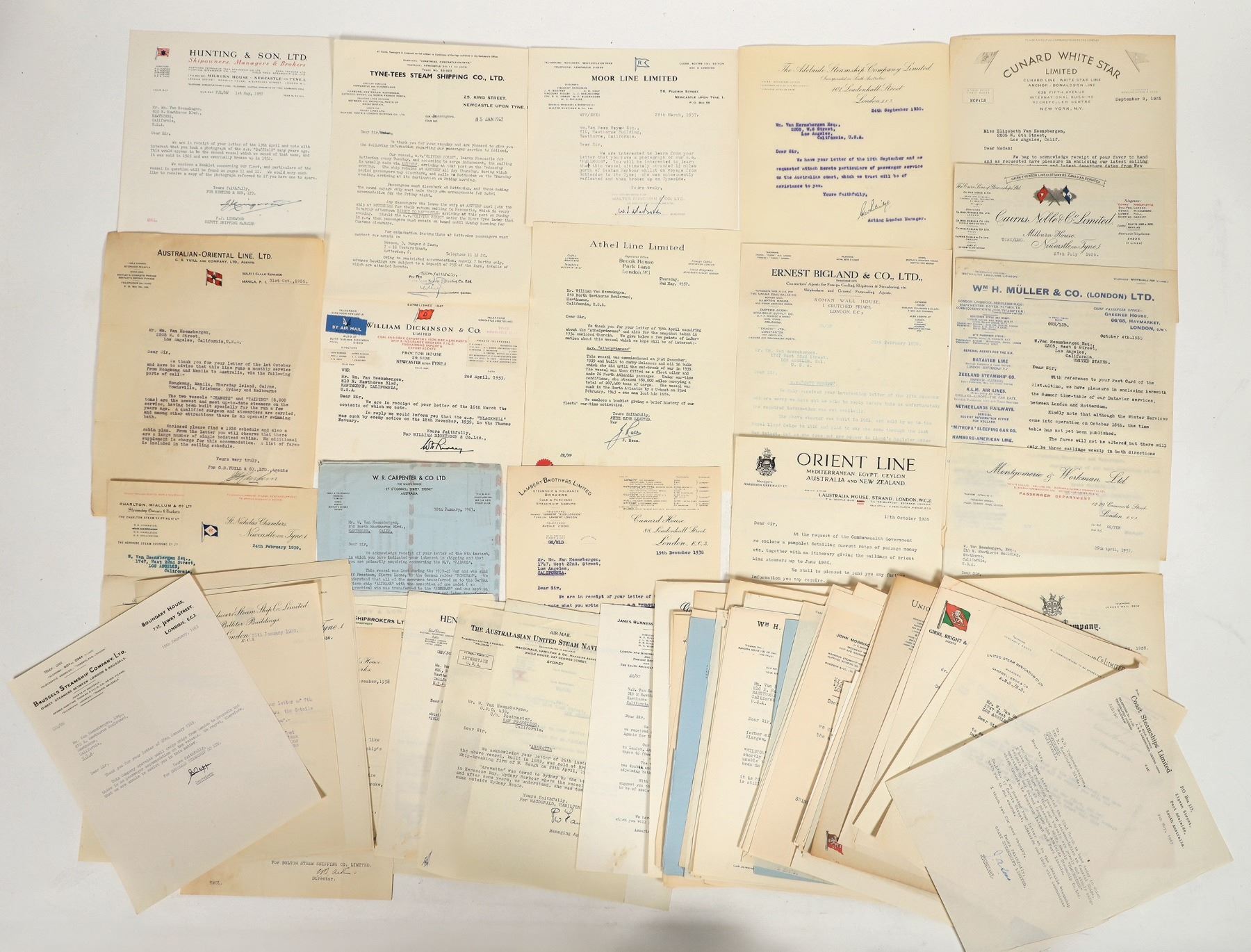 Group of 70+ letterheads and correspondence to William Van Heemsbergen, 1930s-60s. The letters are from steamship companies responding to his requests for information about routes, accidents, details on specific ships, etc. This led us to believe he was either an amateur historian or he was writing a book on steamships. From what we can find, it appears he worked for Standard Oil as a cement contractor before doing the same job in New York City. Shipping companies include: Eastern & Australian Steamship Co. Ltd, Hudson's Bay company, Coast Steamships Ltd., Burnett Steamship Co. Ltd., United Steam Navigation Co., Union Steam Ship Co. of New Zealand, and many more. Please inspect.