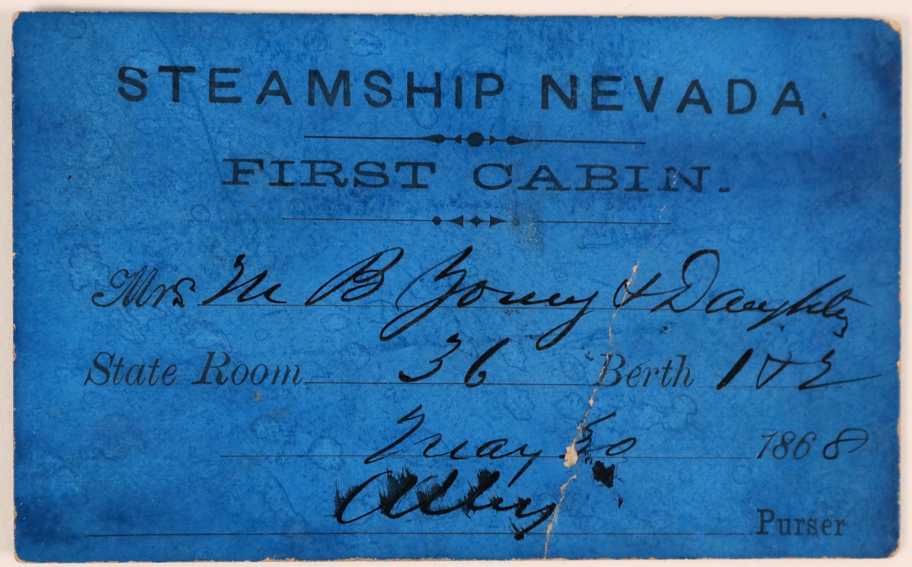 Blue cardboard boarding pass on the Steamship Nevada / First Cabin / Mrs. M.B. Young & Daughters / State Room 36 Berth 1 & 2 / May 30 1868 / (signed) Alley Purser. 3 1/2 x 2 inches. There is a Steamship Nevada that ran aground off Cape Hatteras in foggy weather June 4th, 1868, while enroute from New York City to Havana. All passengers and all but one crewmen survived. Ex: Ron Lerch Collection.