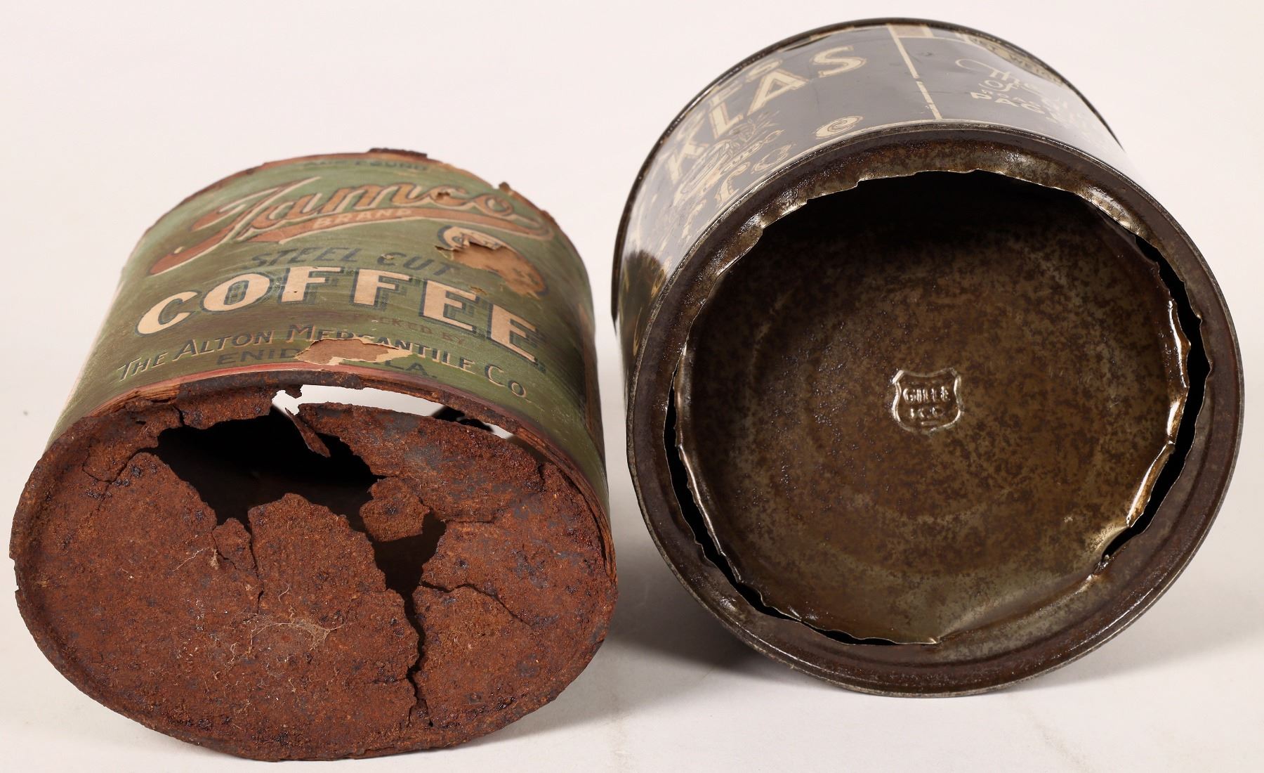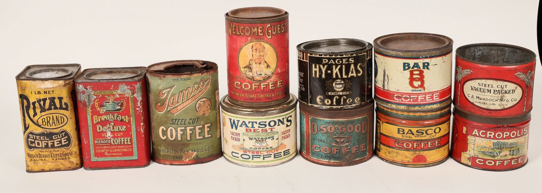 11 different steel cut coffee tins. Steel cut denotes ground or crushed between rolls fitted with cutting teeth for uniform size, still popular today with oatmeal. Rival-cardboard with metal ends, dented, Oval Jamco with paper label-heavy rust top and bottom, Bar-B-Q, Pages Hy-Klas, Tropical, Watson's, Acropolis, Basco with paper label,DeLuxe, Welcome Guest with paper label, )-So_ggod-rust, mainly on lid. Gary Bracken Collection