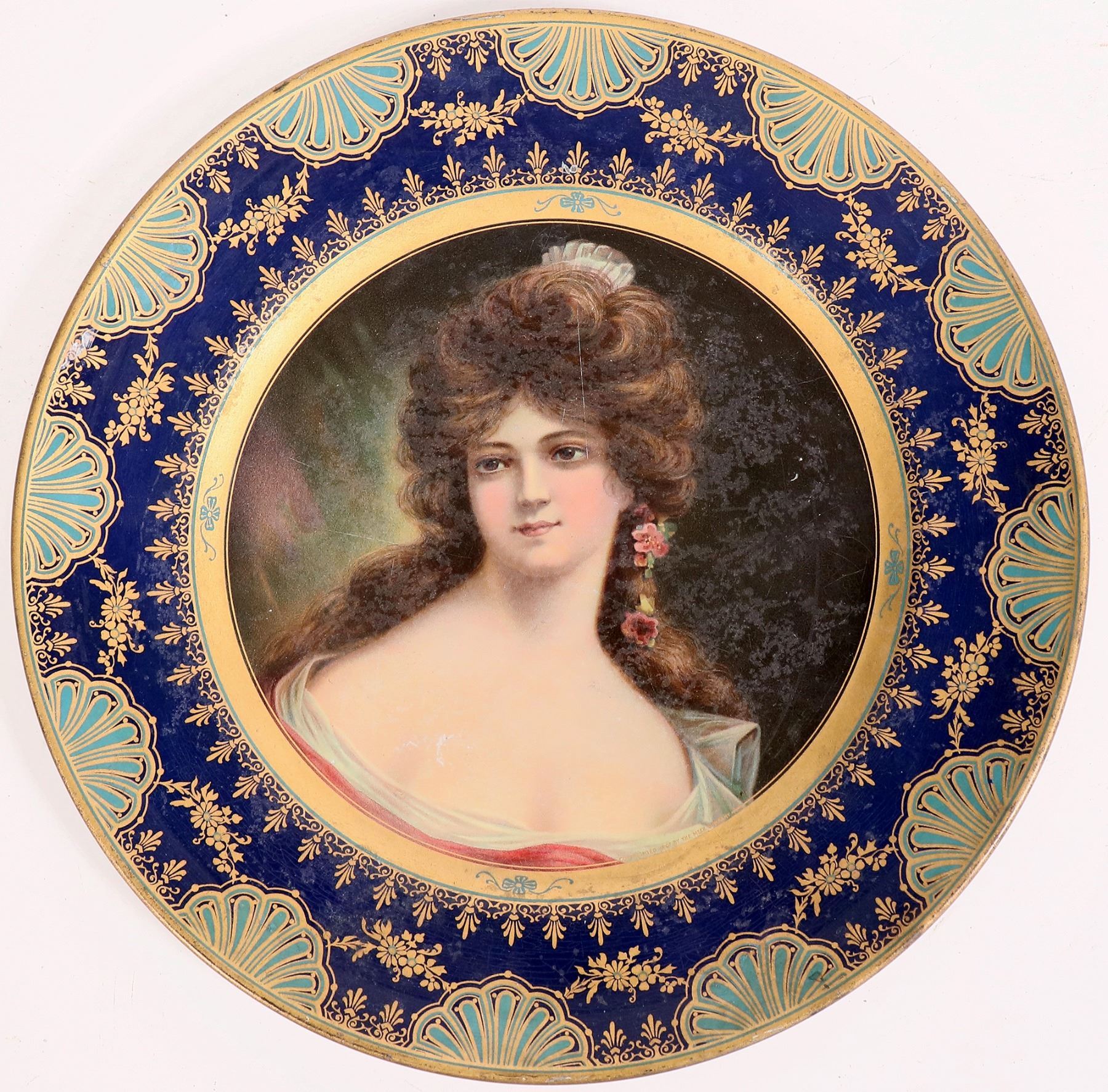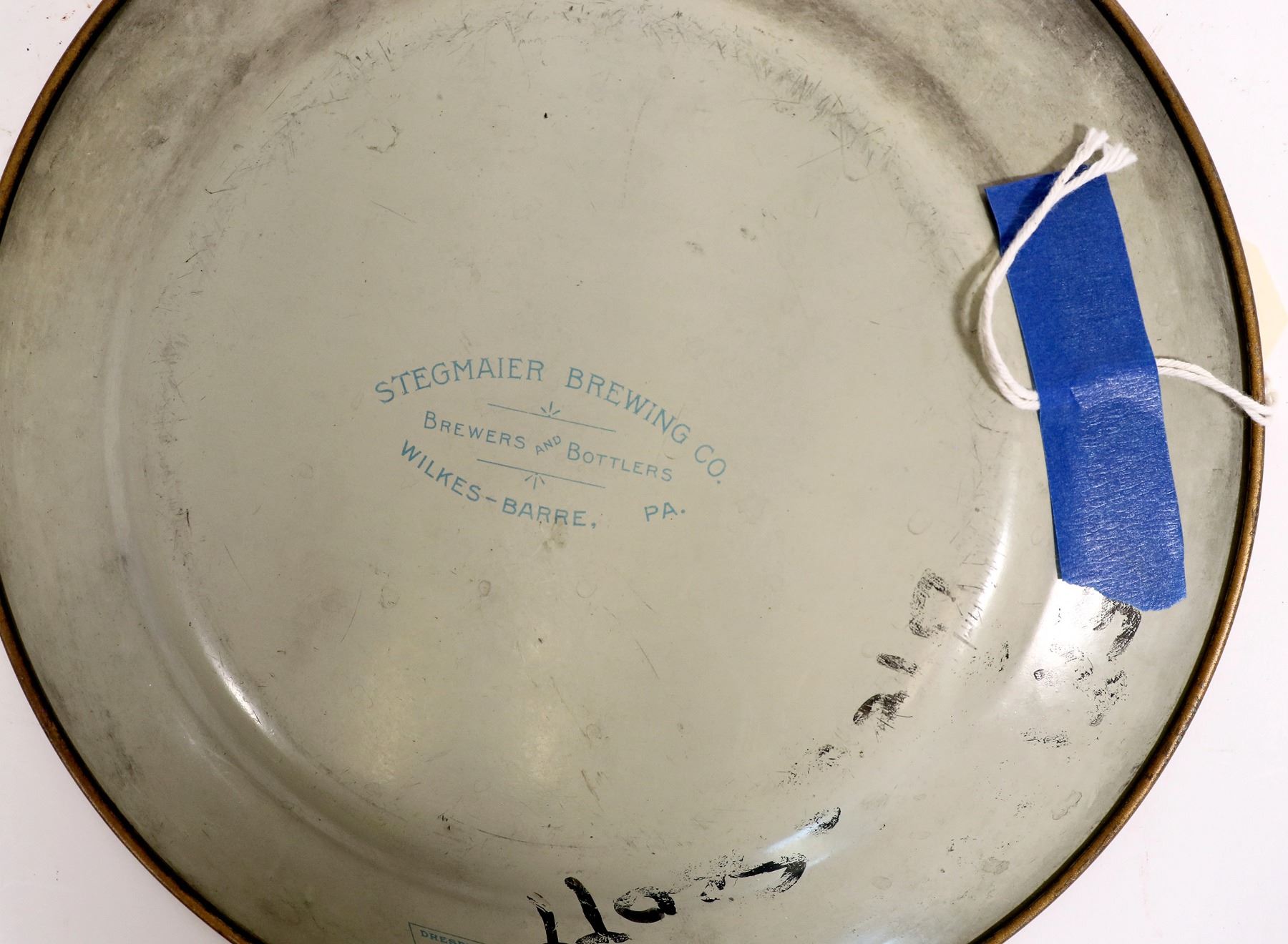 This single serve beer tray depicts a lovely lass with flowers in her hair from the "Stegmaier Brewing Co./ Brewers and Bottlers/ Wilkes-Barre, Pa./ Dresden Art Plates/ made only by the Meek Company of Coshocton, P." 9.5 in. across. heavy scuffs on the base. C. 1910. Pre-pro. Wilkes-Barre Pennsylvania