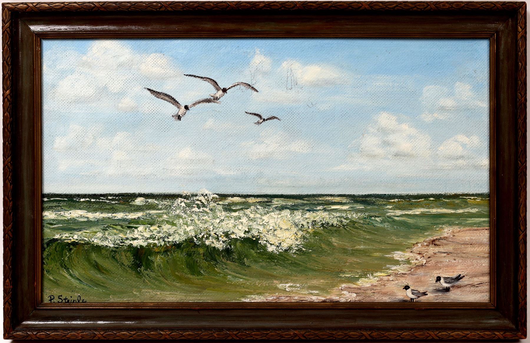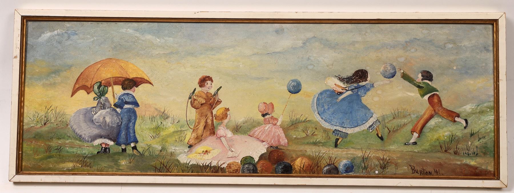 Two original paintings in frames. 1.) Children at play outdoors in period clothing (1800s or Victorian era) measures 24.75" x 8.75" overall size. Signed by artist Burton 41. 2.) "Gulls" by Pat Steinle. Seagulls over the ocean. 22 x 14" overall size. This is a great pair of vintage paintings! City: State: Date: