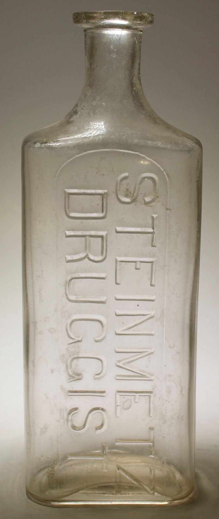 Steinmetz / Druggist // Base: W. T. CO( cu) / 6 / U.S.A. ( cd) / Pat. Dec.11. 1894 // Clear, Tooled top, 8 1/2" x 3 1/8" in size, probably the 16oz . size. Perfect, except for a 1/8" flash, in the rear left shoulder area. Never hit, in making flaw. Very hard to see. Other wise very nice piece. Big impressive looking bottle !! ( RH ). State: Nevada City: Carson City Date: 1893-1903 HWAC# 59272