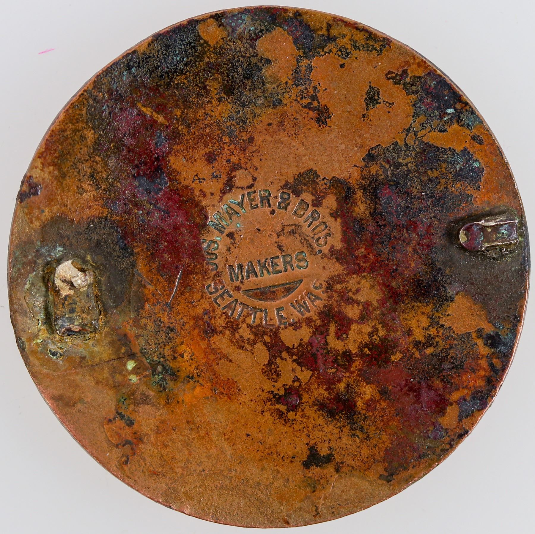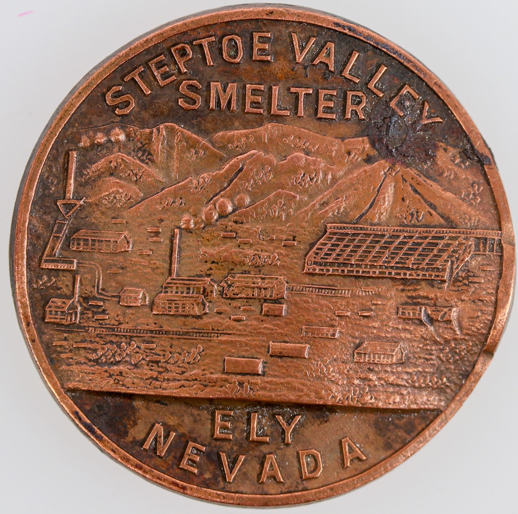 Steptoe Valley Smelter / (view of smelter buildings) / Ely, Nevada. Reverse only has a maker's mark: "Jos. Mayer & Bros. / Makers / Seattle, WA." Bronze, 38mm, concave with slight bend, pin remnants on reverse. In 1906 this company started building a huge smelter at McGill, in Steptoe Valley, eleven miles north of Ely. It was completed in 1908 and operated until 1983. This pin must have been made during 1908 to 1920, when Jos. Mayer split away from his brothers.