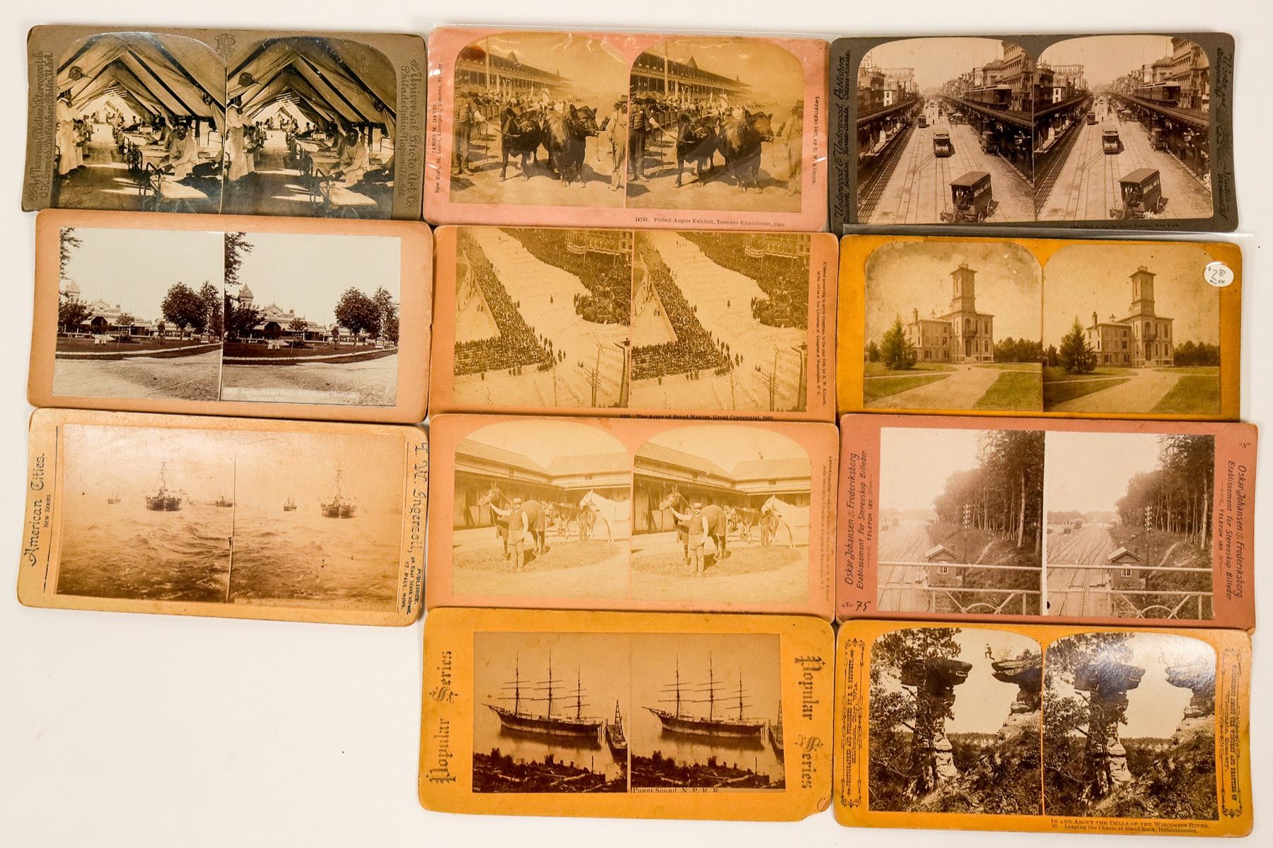 Stereoscope and 11 stereo cards, c1861 on. Wooden stereoscope with decorative brass covering, has no identifying label, but this type of stereoscope was invented by Oliver Wendell Holmes in 1861. Stereo cards are dated 1889-1902, and include a variety of images of daily life in the late 19th, early 20th century.