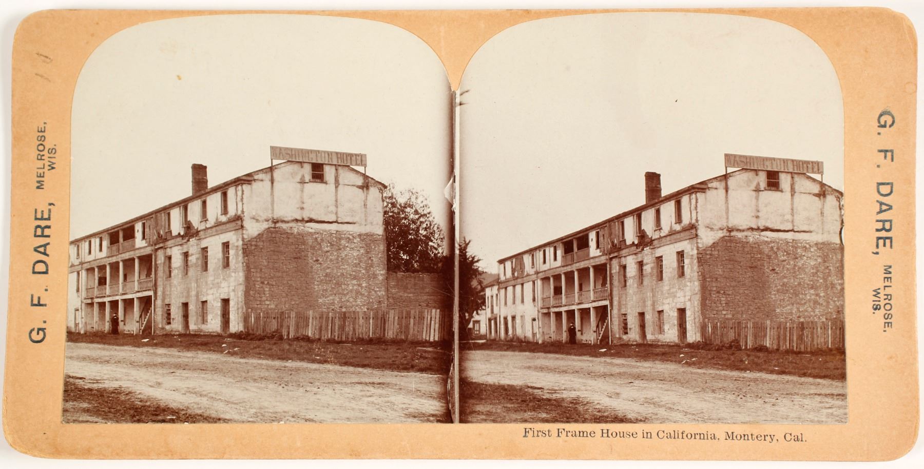 "Scarce stereoview by G.F. Dare, photographer, Melrose, Wis. Pictured is the Hotel Washington (sign clearly legible), the first hotel built in California. The hotel was built before California statehood in 1832. For some reason, Dare titled this view, ""First Frame House in California, Montery, Cal."" Note that this eastern photographer didn't even know how to spell Monterey correctly. Zoom in on the hotel's sign clearly reads Washington Hotel. The hotel no longer exists, but lasted until the early 1900's. Photos and mount in good condition.
