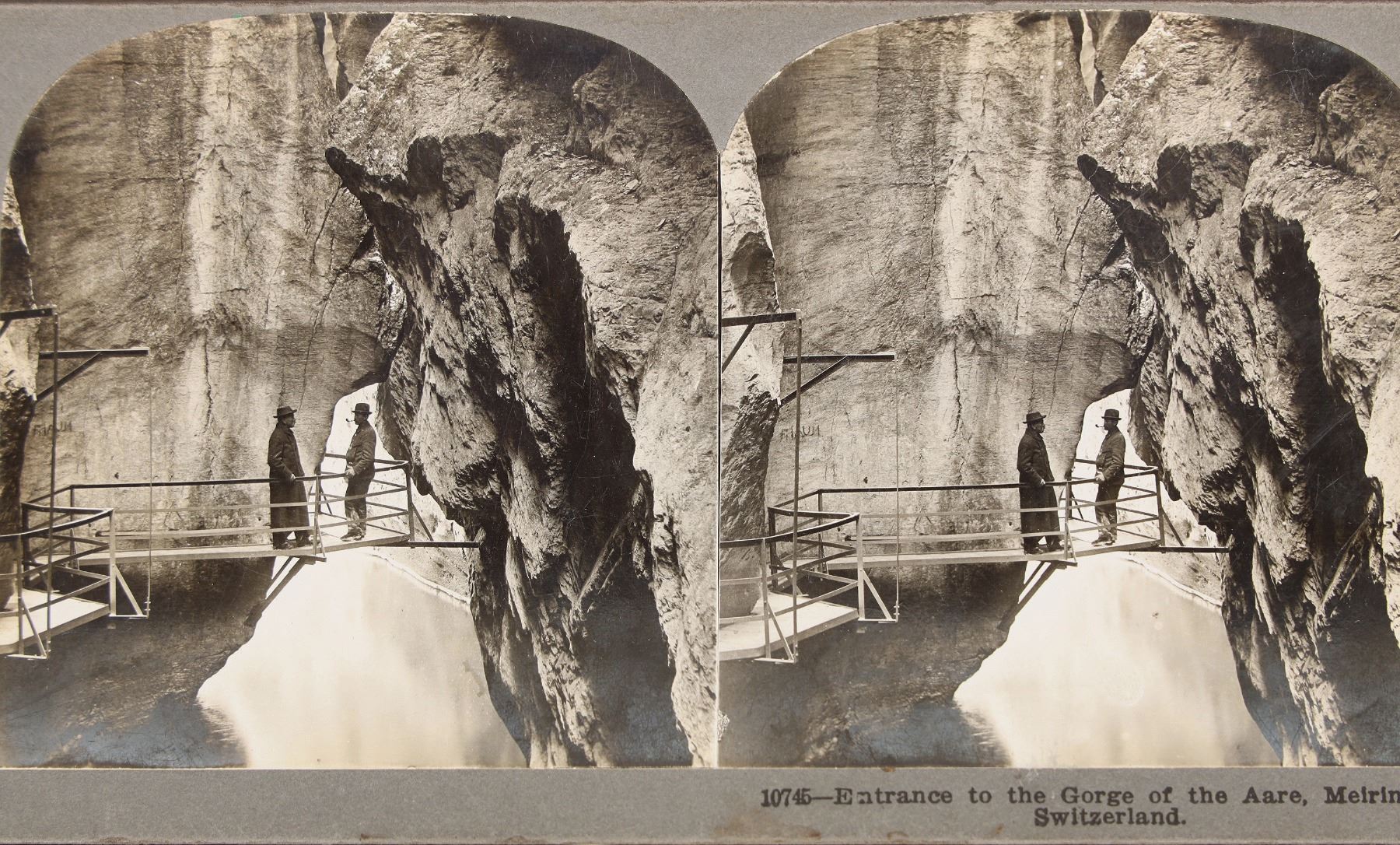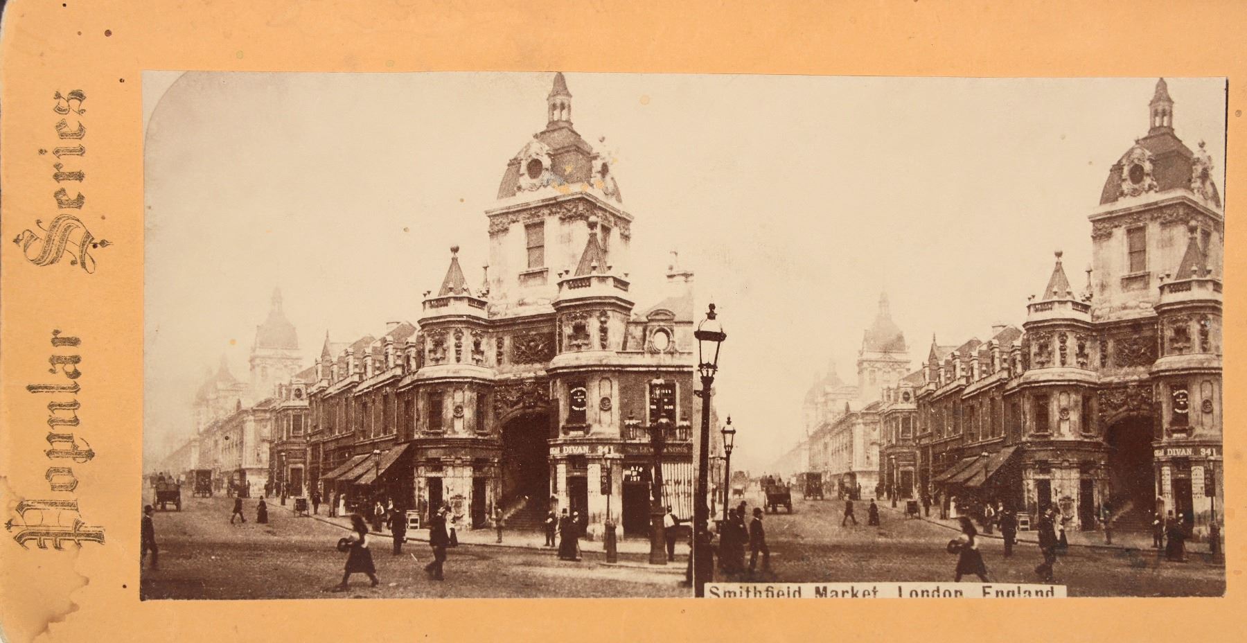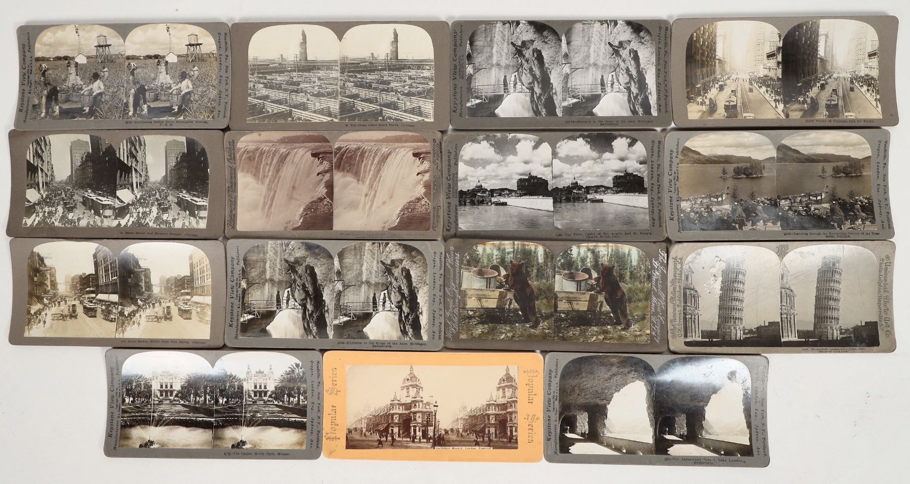 Fifteen vintage stereo view cards: Harvesting Indian River pineapples Florida; Great Union Stock Yards Chicago; 51 State Street Chicago; views of Chicago and Its Parks; State Street Chicago; Horseshoe Falls, Niagara; Swiss Alps; Smithfield Market, London; The Casino Monte Carlo; Trossaschs, Scotland; leaning tower of Pisa; Castle of San Angelo on the Tiber River; Lake Lucerne; bear investigating a wagon.