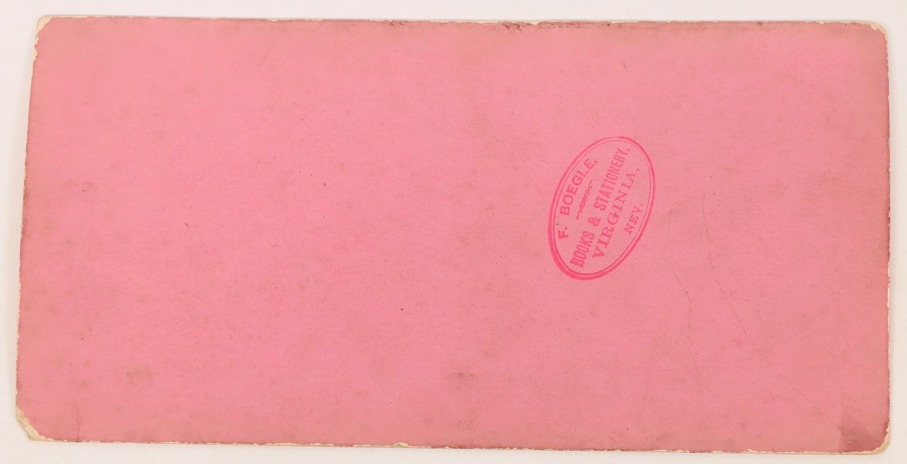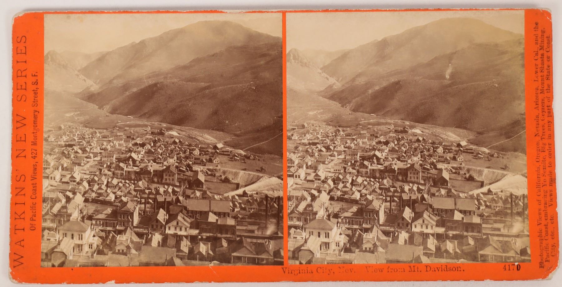 Rare view looking down on Virginia City and down Sixmile Canyon." Watkins' New Series of Pacific Coast Views, 427 Montgomery Street, S.F. ( c.1880-1888). What makes this stereoview even more special is that it is stamped on the back from "F. Boegle, Books & Stationery, Virginia, Nev." So it was sold in a Virginia City store! Rare view with Sugarloaf in the upper left. Multiple business signs are readable incl. Robert Biroth, US Hotel & Restaurant, Occidental, and PH Ford.