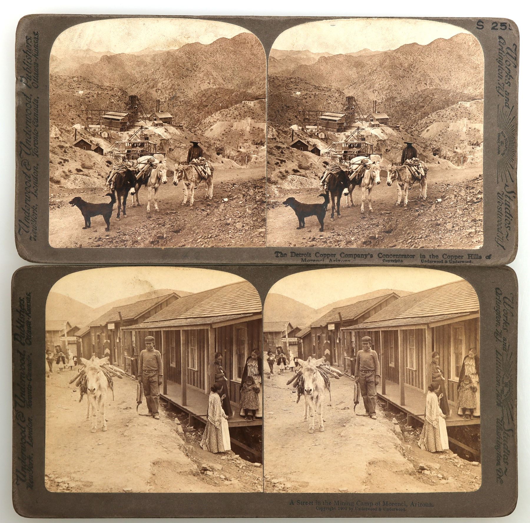 These are two stereoviews of the Morenci mining area. On the left edge "Underwood & Underwood Publishers/ New York, London, Toronto-Canada, Ottawa-Kansas" on the right edge "Works and Studios/Arlington, N J., Westwood, N.J." grey mount front and back. "The Detroit Copper Company's Concentrator in the hills of Morenci Arizona" printed bottom below right image. c. 1903. "S-25x " ink stamped upper right corner. The back in print: "6142- The Detroit Copper Company's concentrator in the copper hills of Morenci, Arizona", printed in several languages. The image depicts the buildings in the background and several packed burros in the foreground. Good color contrast, foxing on the right edge. (ref. Arizona Stereographs 1865-1930 by Rowe, p.290). The second card is has identical edge markings, grey mount front and back. "A street in the mining camp of Morenci, Arizona/ copyrighted 1903". This image depicts reasonable housing with women and children, a miner with a packed burro in the street. No markings on the back. Not listed in the the Rowe catalog. Rare. Excellent color contrast, sharp image, no foxing. 7 in. X 3.5 in. The Morenci mining district held 145 claims at one point. There was also the Morenci Southern narrow gauge railroad completed in 1901 that connected a number of mines over 18 miles of rail in addition to the "baby" gauge railroad connecting the mine works and plants. Arizona c. 1903-1905