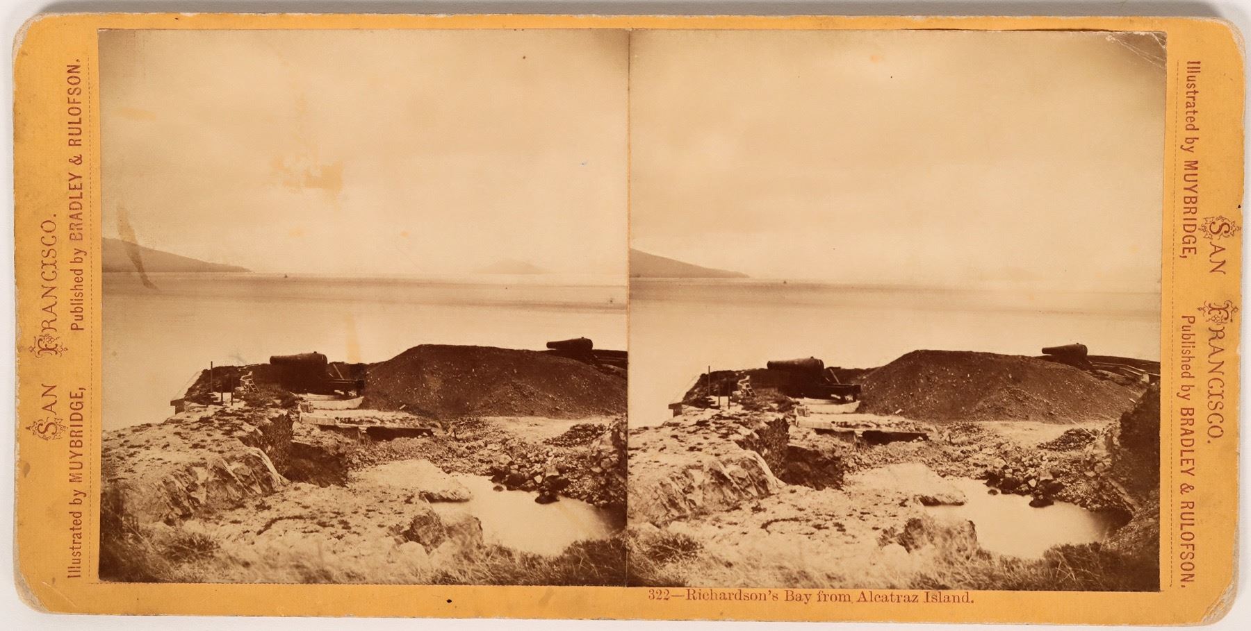 This is a single stereo-view of Alcatraz Island with coastal artillery cannons in the foreground looking north out to Richardson Bay. c.1864. The photograph was taken by Eadweard Muybridge and published by Bradley and Rulofson. Muybridge is best known for his photography of a horse in motion and later humans in motion which laid the principles of motion pictures that developed into the motion picture industry that we know today.