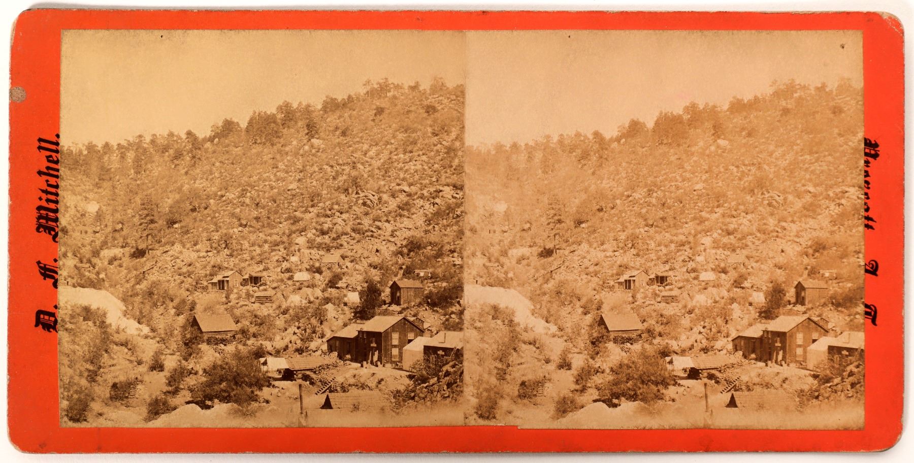 This stereoview is by photographer Daniel F. Michell orange mount on front, pink on the back. Marked on the front in gothic print "D.F. Michell/ Prescott, AZ" partially covered. No other markings on the back. Image is of an unknown Prescott area mine. 7 in. X 3.5 in. Low contrast good condition. Prescott Arizona c. 1880s