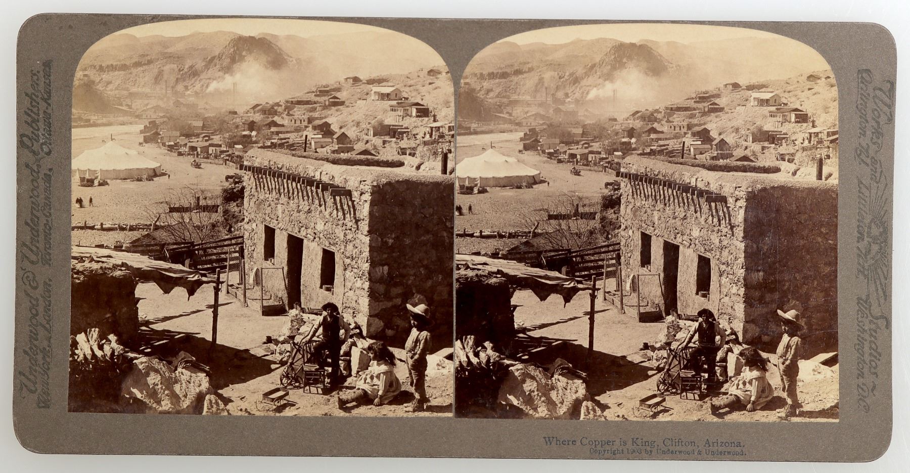 This stereoview is by photographers Woodward & Woodward on a grey curved mount, c. 1903, marked "Woodward & Woodward Publishers New York, London, Toronto, Canada, Otawa, Kansas" in the border. "Works and Studios Arlington, New Jersey, Littleton, New Hampshire, Washington D.C." in the opposite border. It is "Where Copper is King Clifton, Az," No identifiers on the back. (ref. Arizona Stereographs 1865-1930 by Rowe p. 292). Excellent condition, sharp focus and high contrast, 7 in. X 3.5 in. Arizona c. 1903