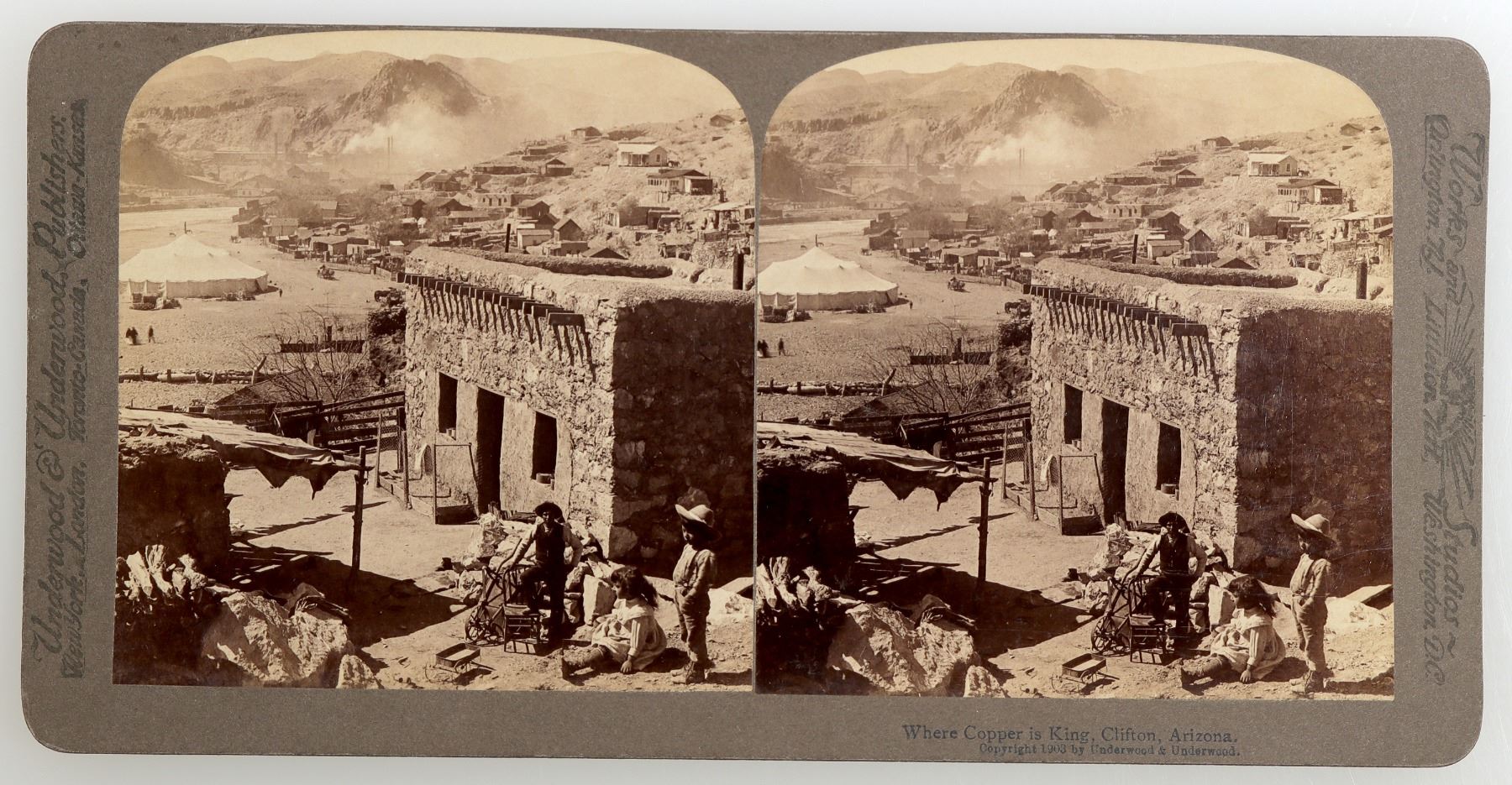 This stereoview is by photographers Woodward & Woodward on a grey curved mount, c. 1903, marked "Woodward & Woodward Publishers New York, London, Toronto, Canada, Otawa, Kansas" in the border. "Works and Studios Arlington, New Jersey, Littleton, New Hampshire, Washington D.C." in the opposite border. It is "Where Copper is King Clifton, Az," No identifiers on the back. (ref. Arizona Stereographs 1865-1930 by Rowe p. 292). Excellent condition, sharp focus and high contrast, 7 in. X 3.5 in. Arizona