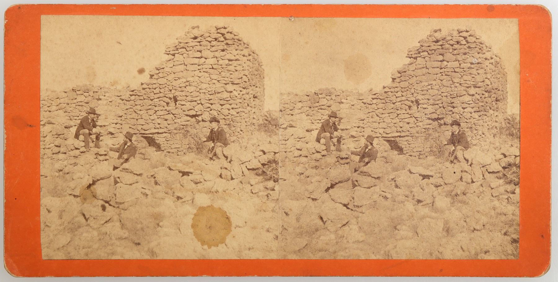 Stereoview of Old Ruins at Aztec Mound Mouth of Oak Creek by D.F. Mitchell c1875-82. This stereoview is by photographer Daniel F. Mitchell and is marked in script on the back "old ruins on Aztec Mound at mount of Oak Creek/ Yavapai Co. Arizona/ D.F. Mitchell Photographer/ Prescott, A.T." in an oval shape. c.1875-1882, orange mount front/ lavender mount back. (ref. Arizona Stereographs 1865-1930 by Rowe p. 283). No identifiers on the front, spot on left image. Very good condition. 7 in. X 3.5 in. [Arizona]