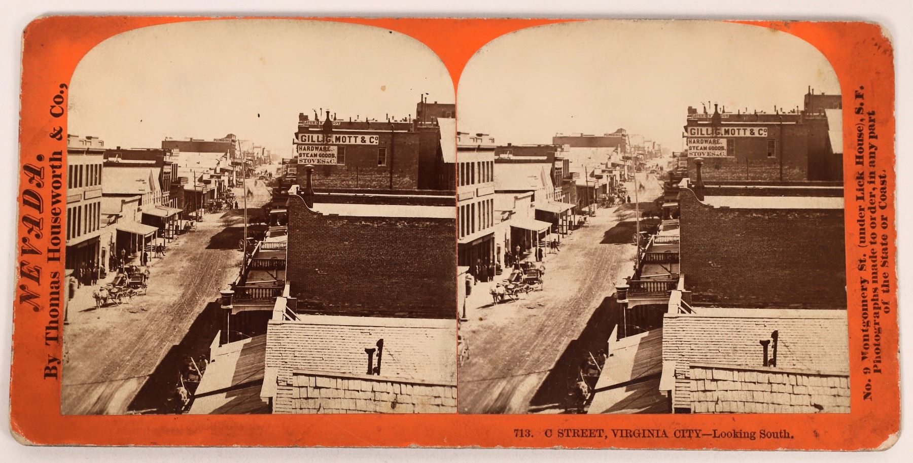 This is an c.1860s view (see the CDV also in this sale) being reproduced on a stereoview in the 1870s. Excellent early view of the main street in Virginia City, with Gillig, Mott & Co. hardware building identified on the right (makers of the famous Gillig mining lanterns). "Nevada", "713. C Street, Virginia City--Looking South." Published by Thomas Houseworth & Co., No. 9 Montgomery St., SF. Good contrast and focus, fantastic content. Rare view!